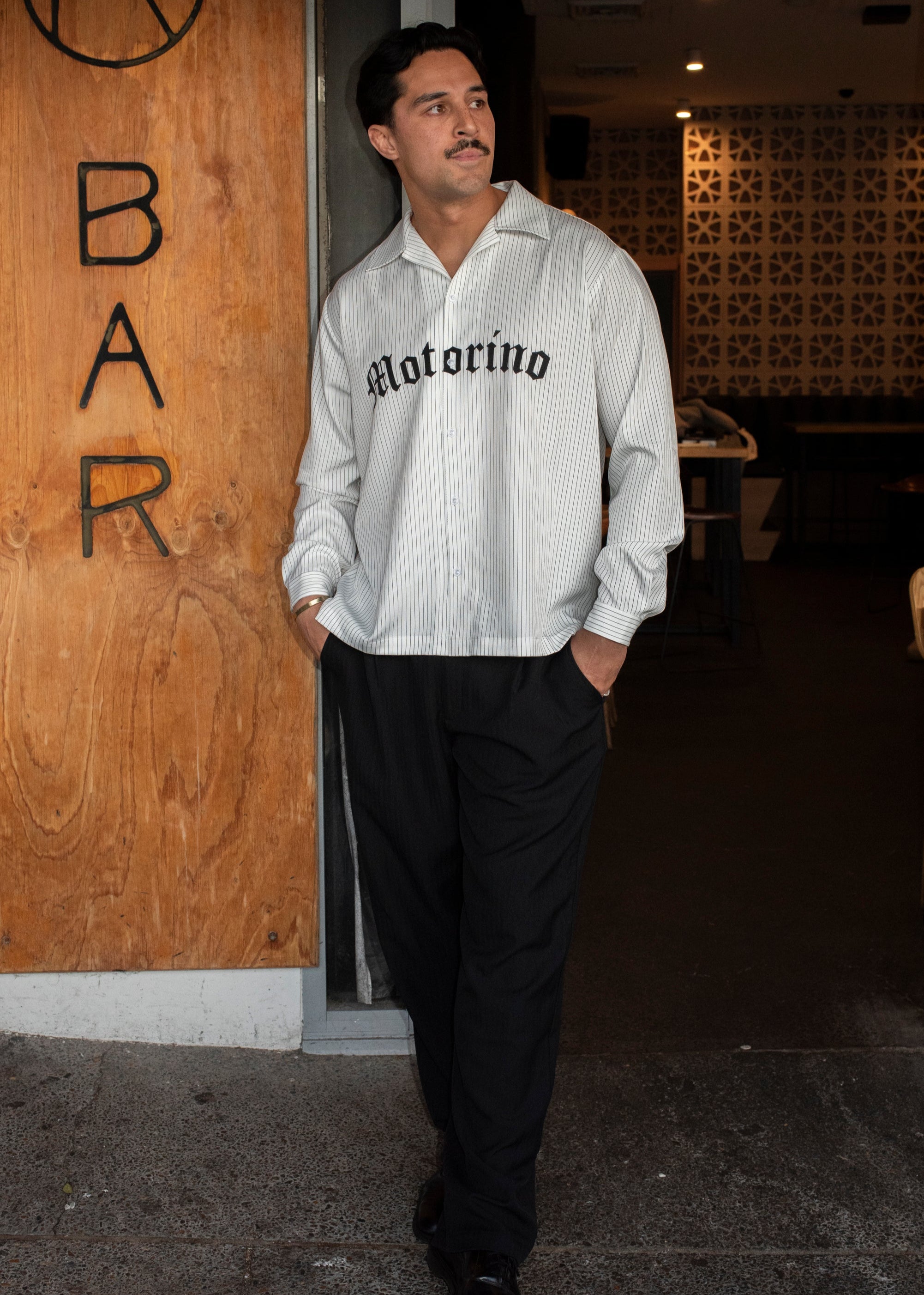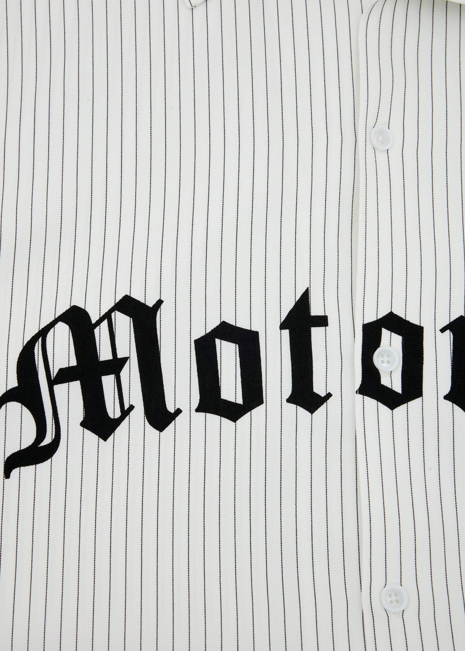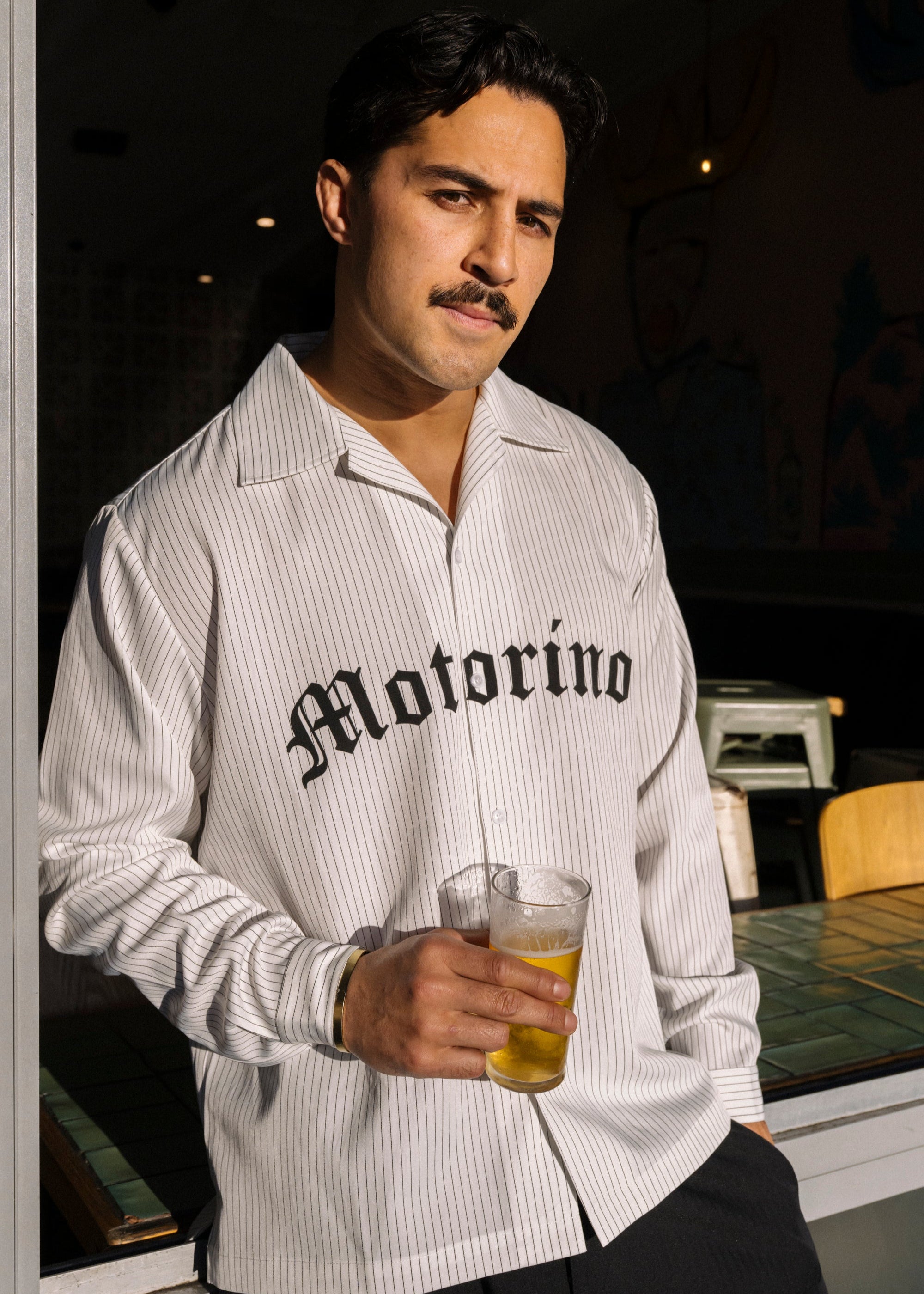 The Motorino Pinstripe Shirt is crafted from lightweight cotton poplin with a clean black-and-white stripe pattern. Featuring a relaxed fit with a classic collar, button closure, and bold Old English Motorino logo across the chest, it blends refined shirting with street-inspired edge. Perfect for layering or wearing solo, it’s a versatile staple, making you look sharp with ease.