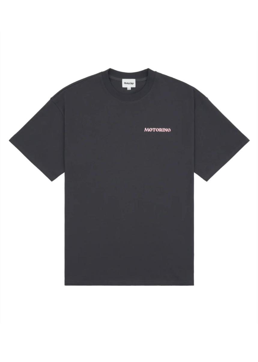 - Soft pastel pink contrasting with the faded/off black tee