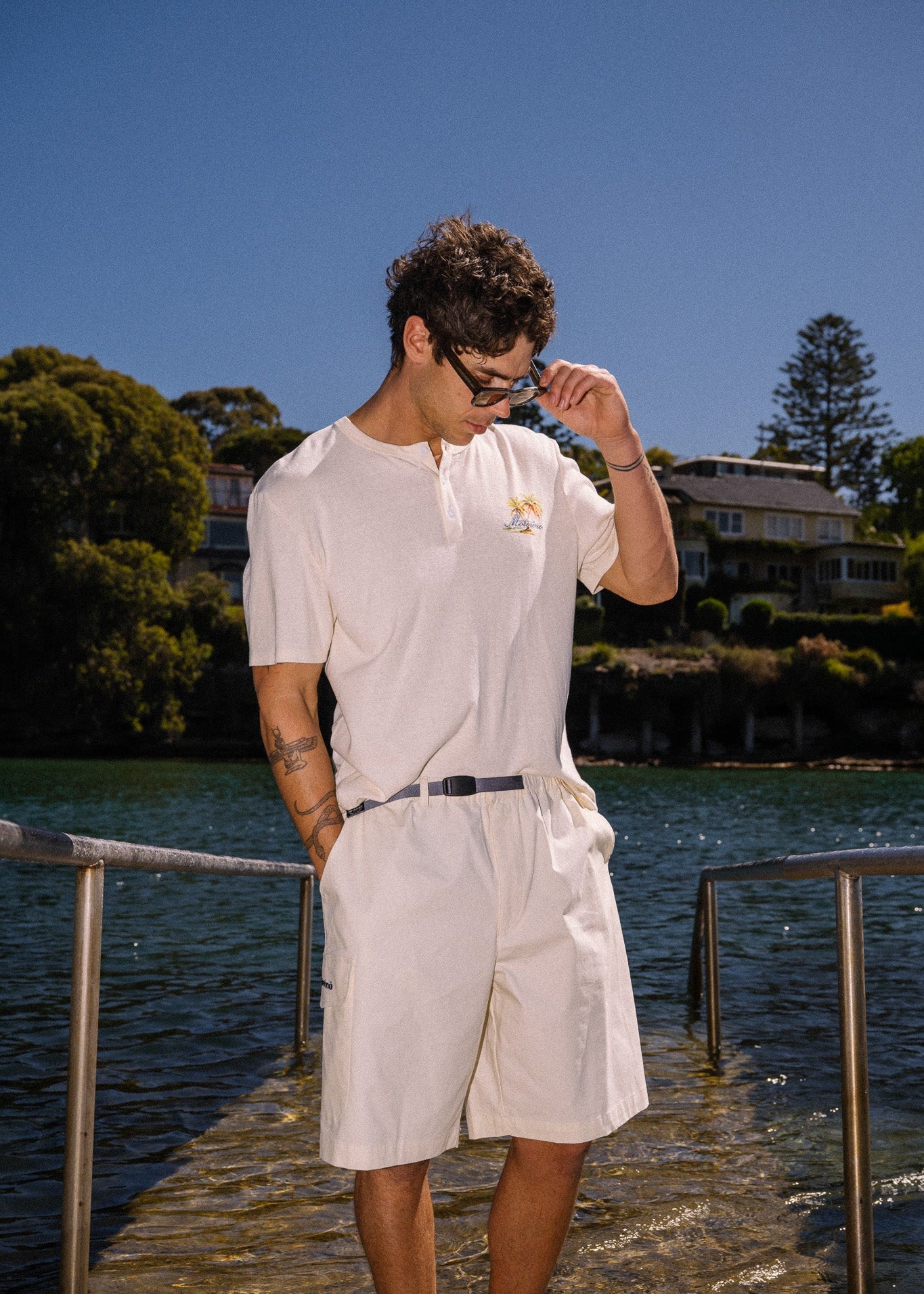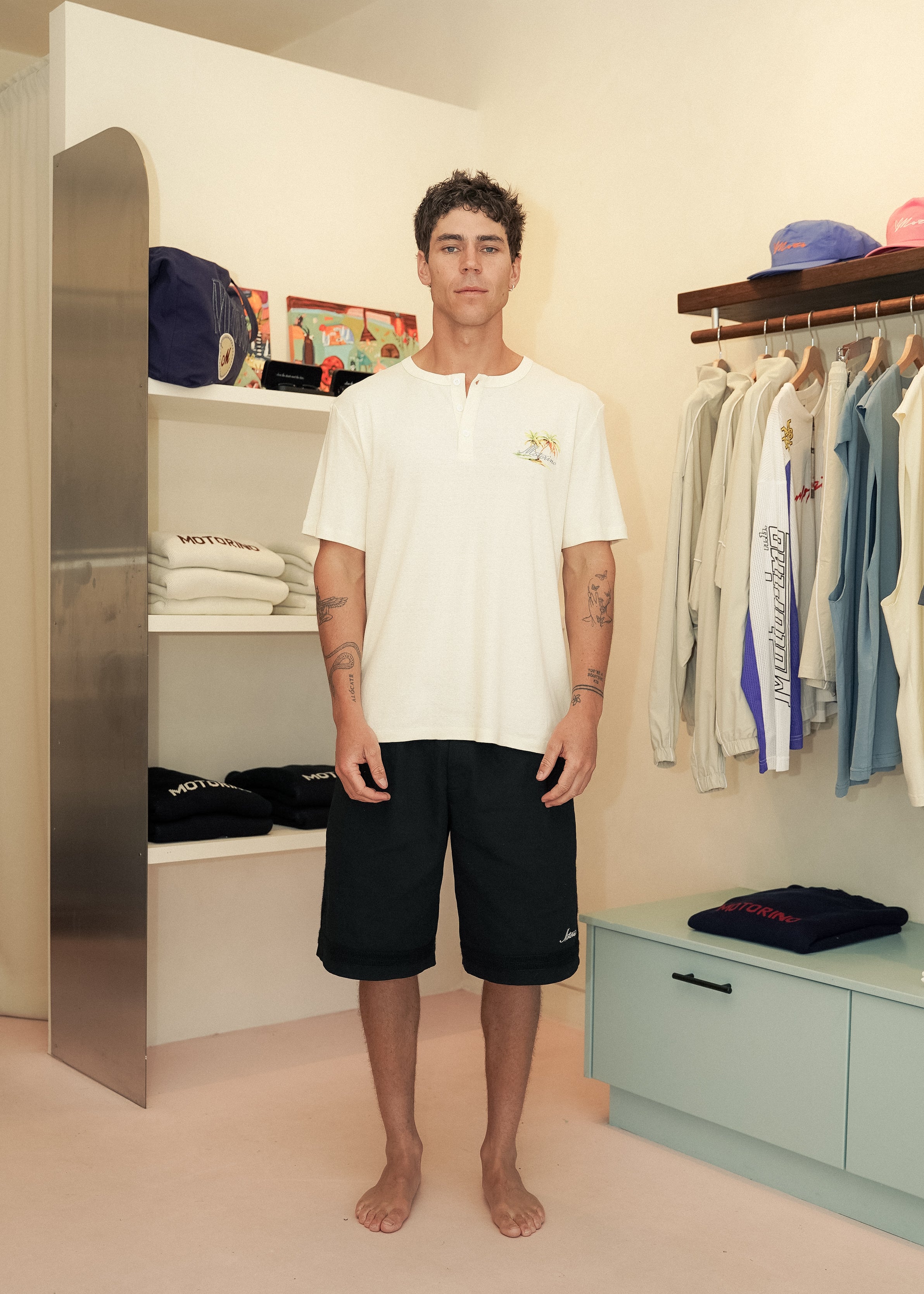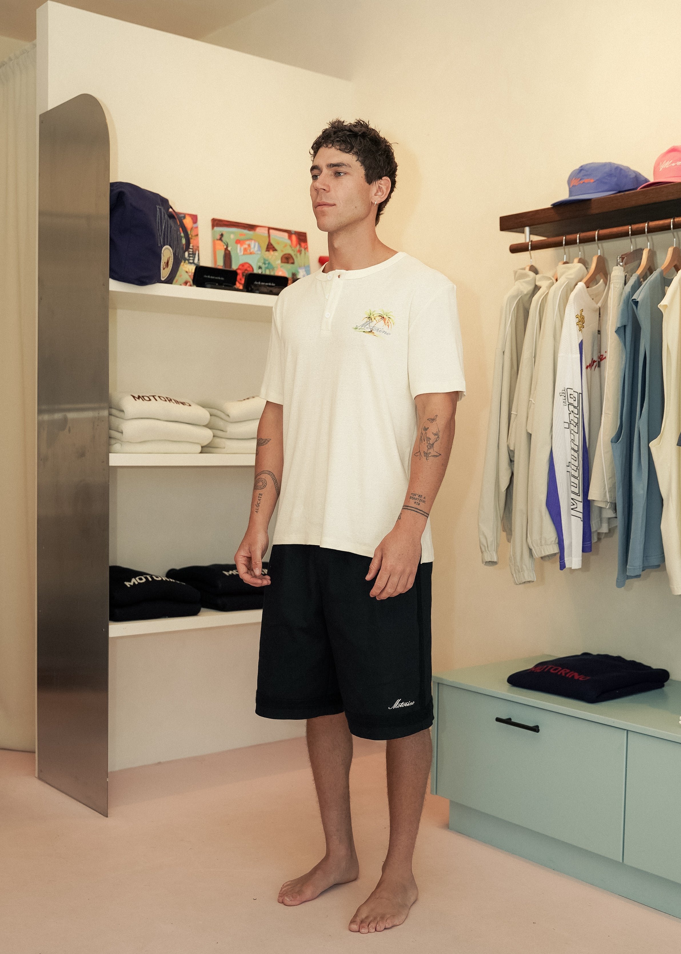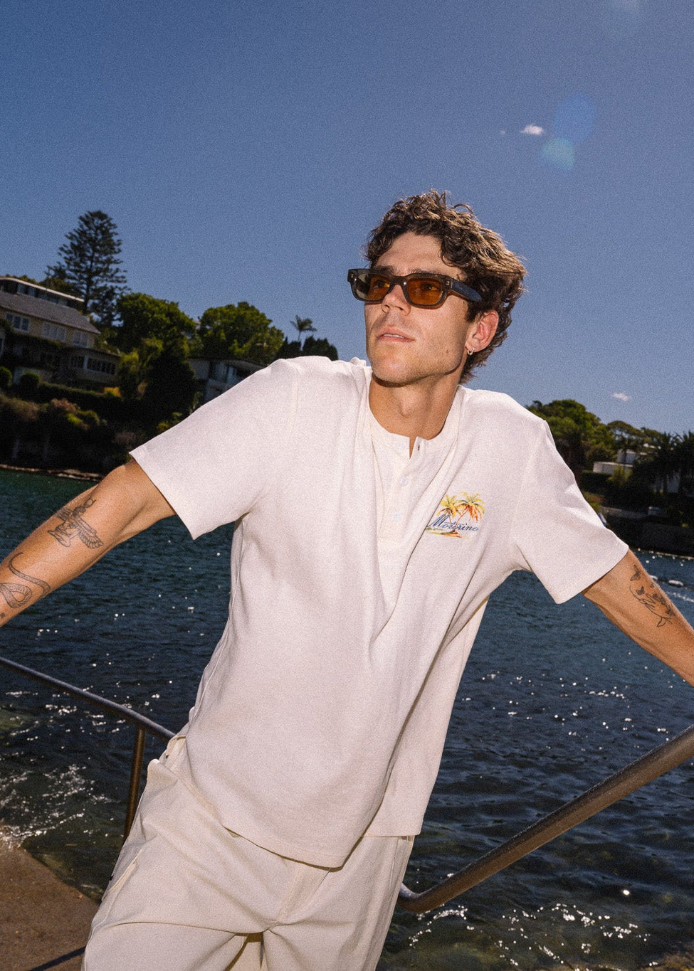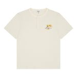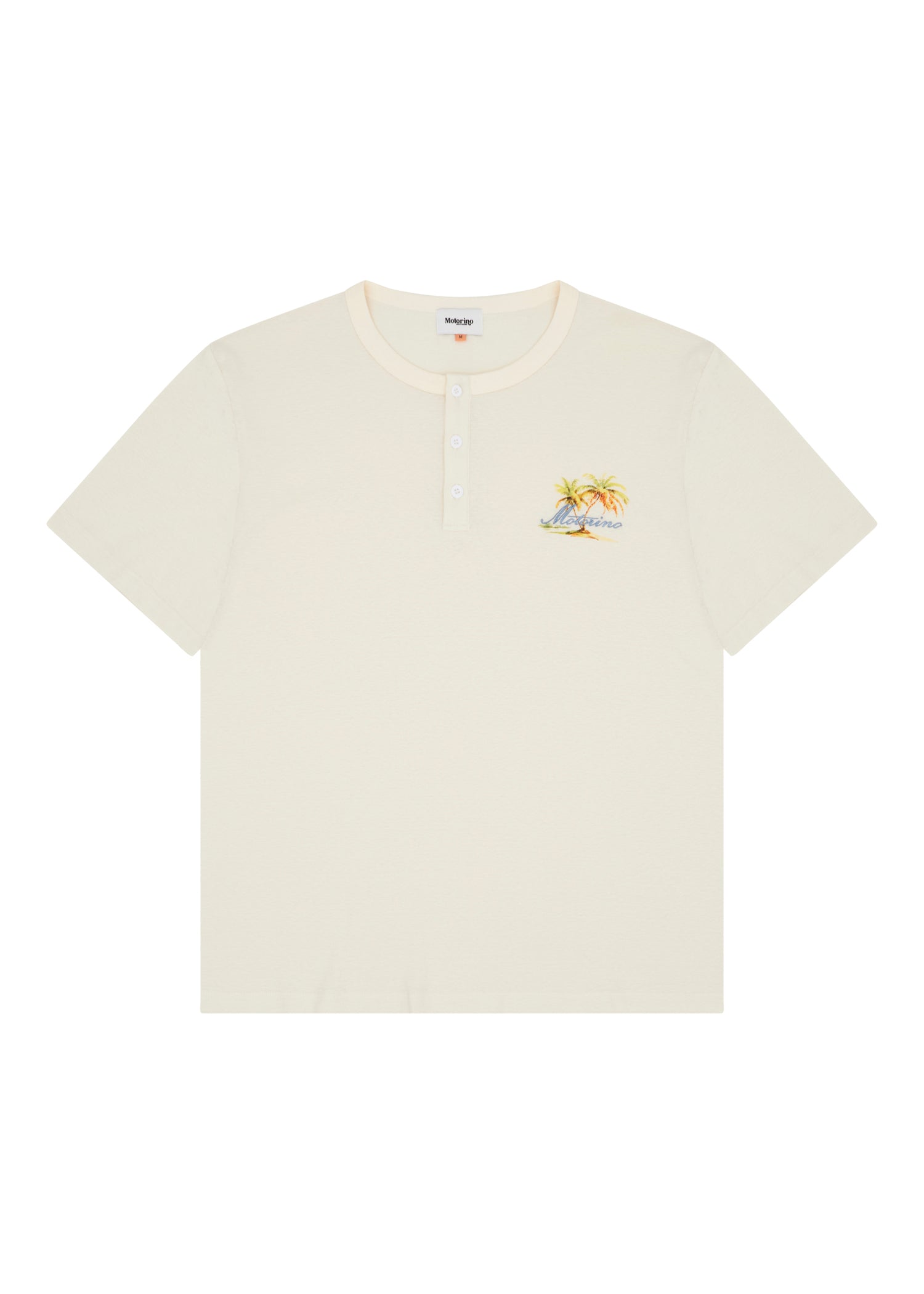 The Motorino Henley Tee brings a dose of holiday energy to an everyday essential. Made from our soft, breathable cream cotton, it features a classic three-button henley placket paired with a vintage-inspired tropical chest graphic — embroidered and printed for a textured, dimensional finish. The fit is easy and relaxed.