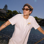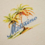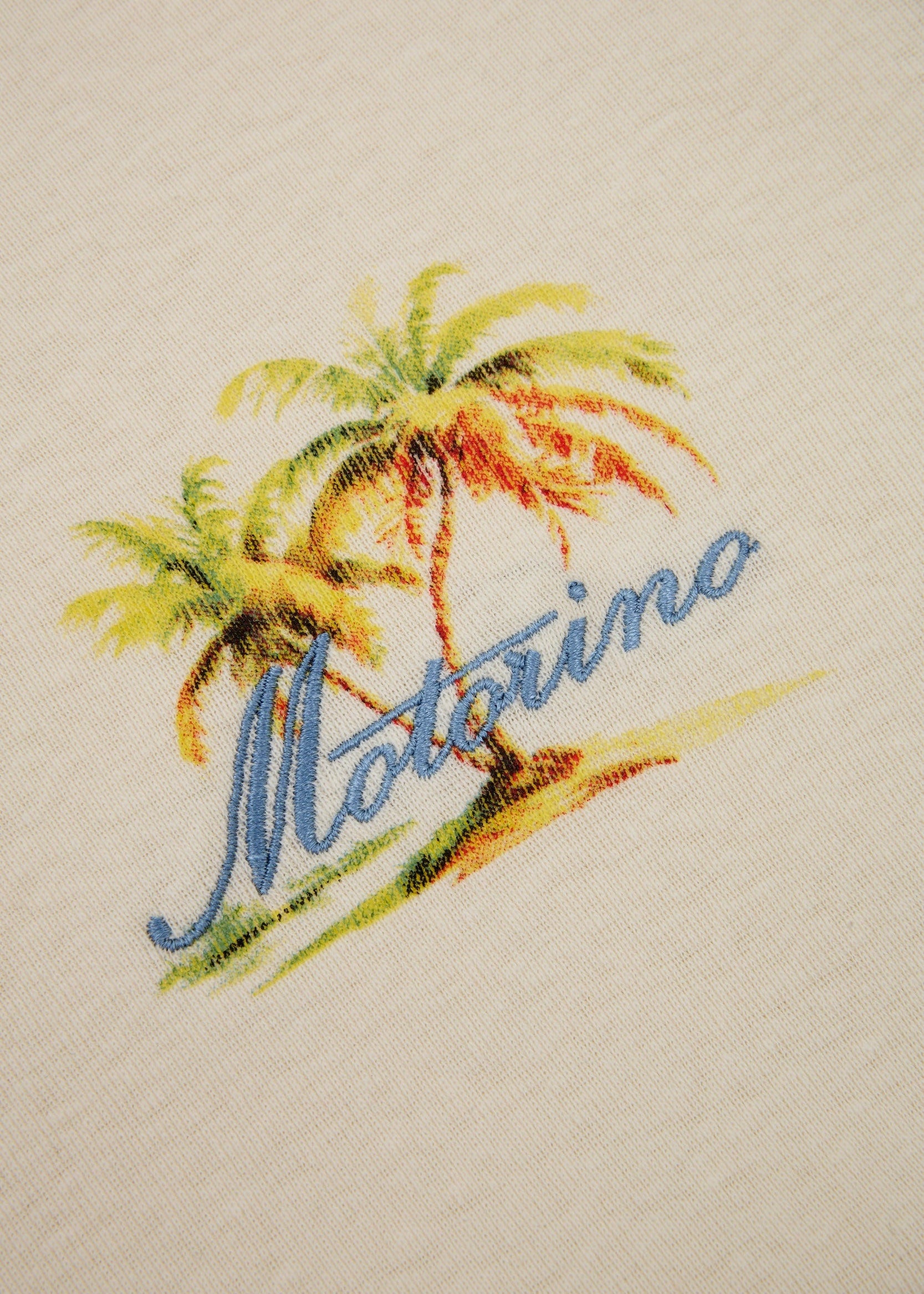 - Tropical chest artwork, combining print + embroidered Motorino script