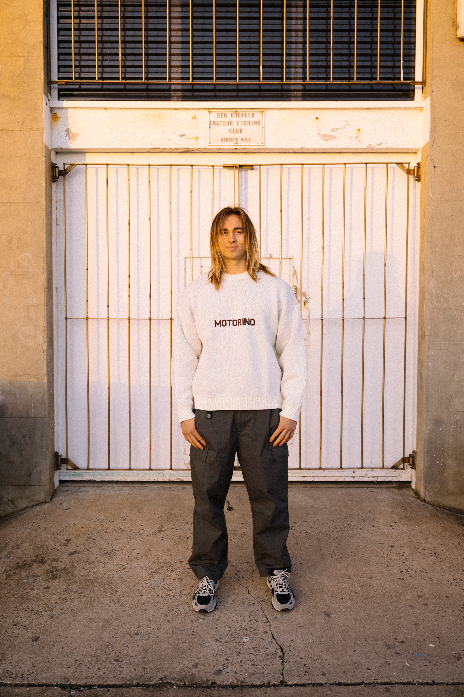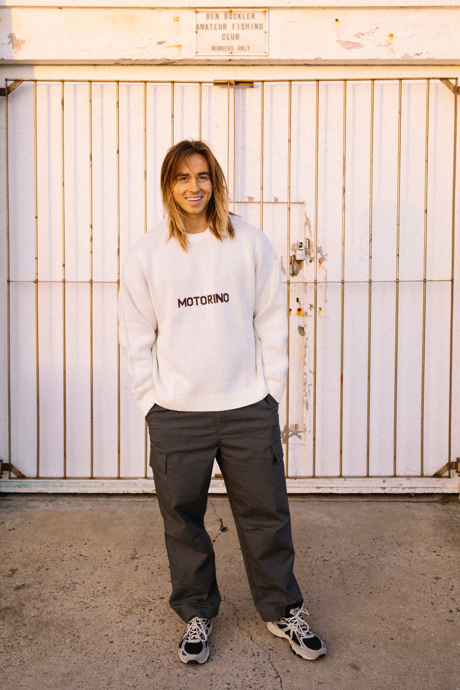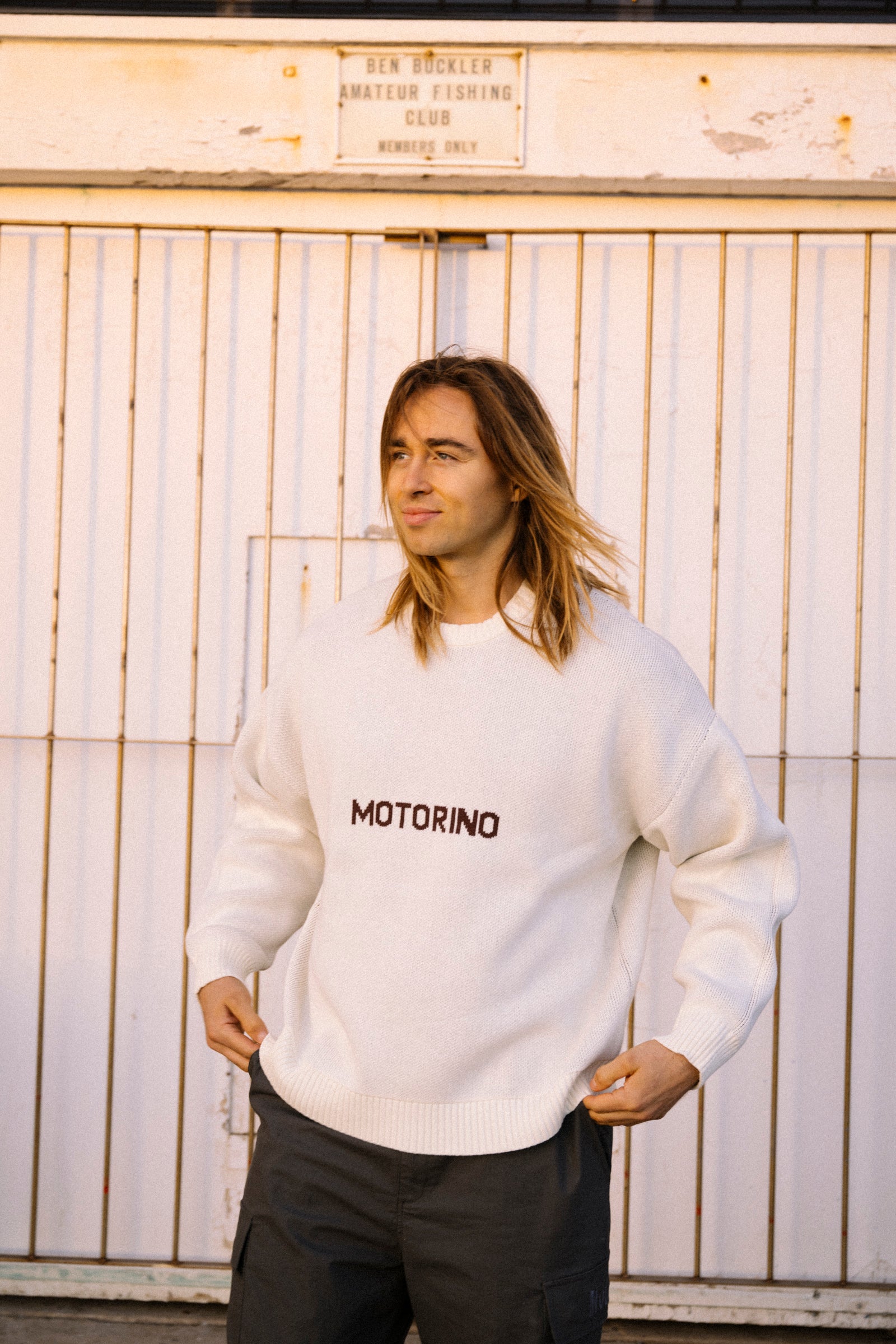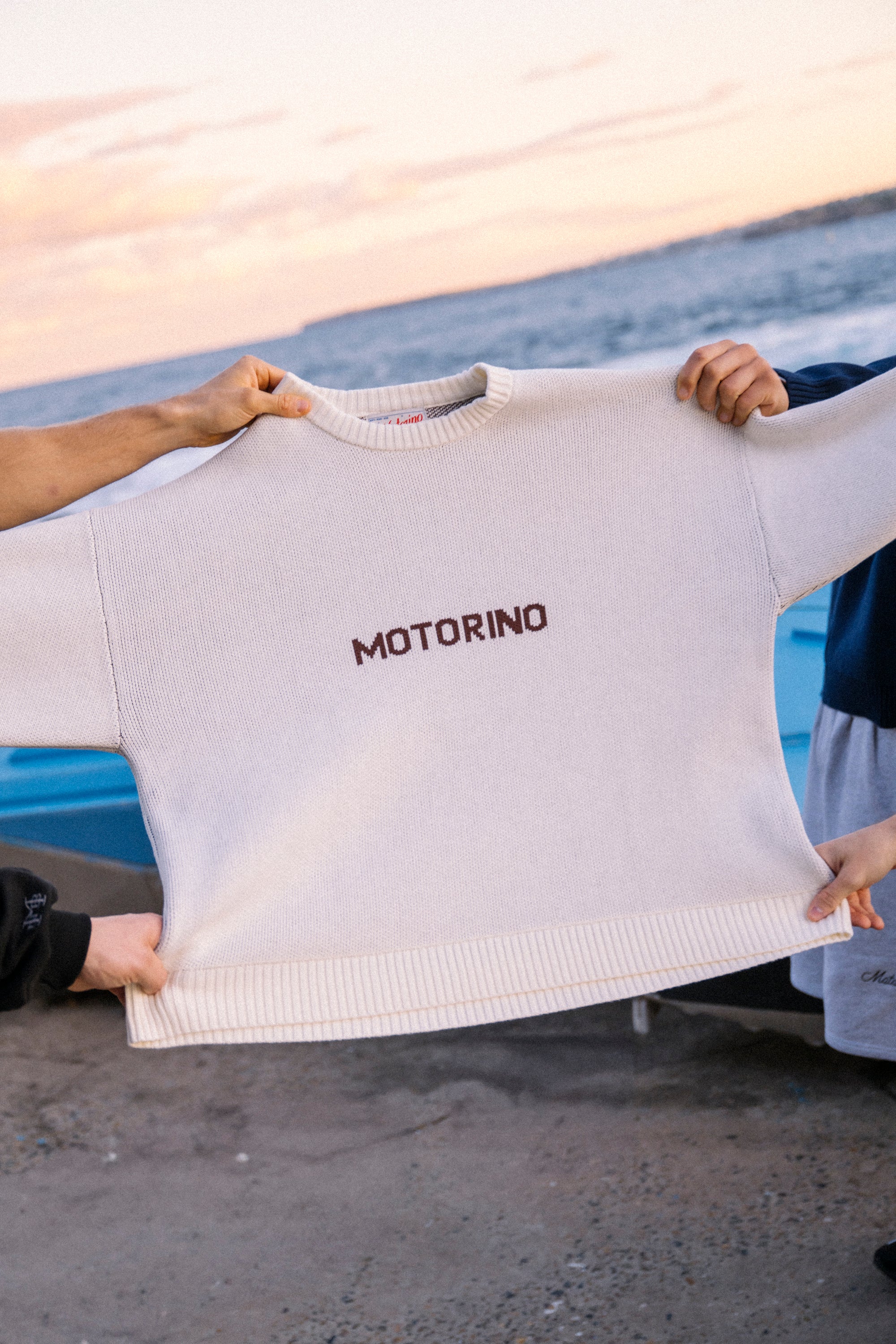 Motorino's knit game is back, but levelled up in an off-white and brown colour combination. Our most premium garment we've released to date. Featuring a perfectly cropped waist, dropped shoulders, thick neck and wrist trimmings. A versatile and warm crew that is easy to dress it up or down.