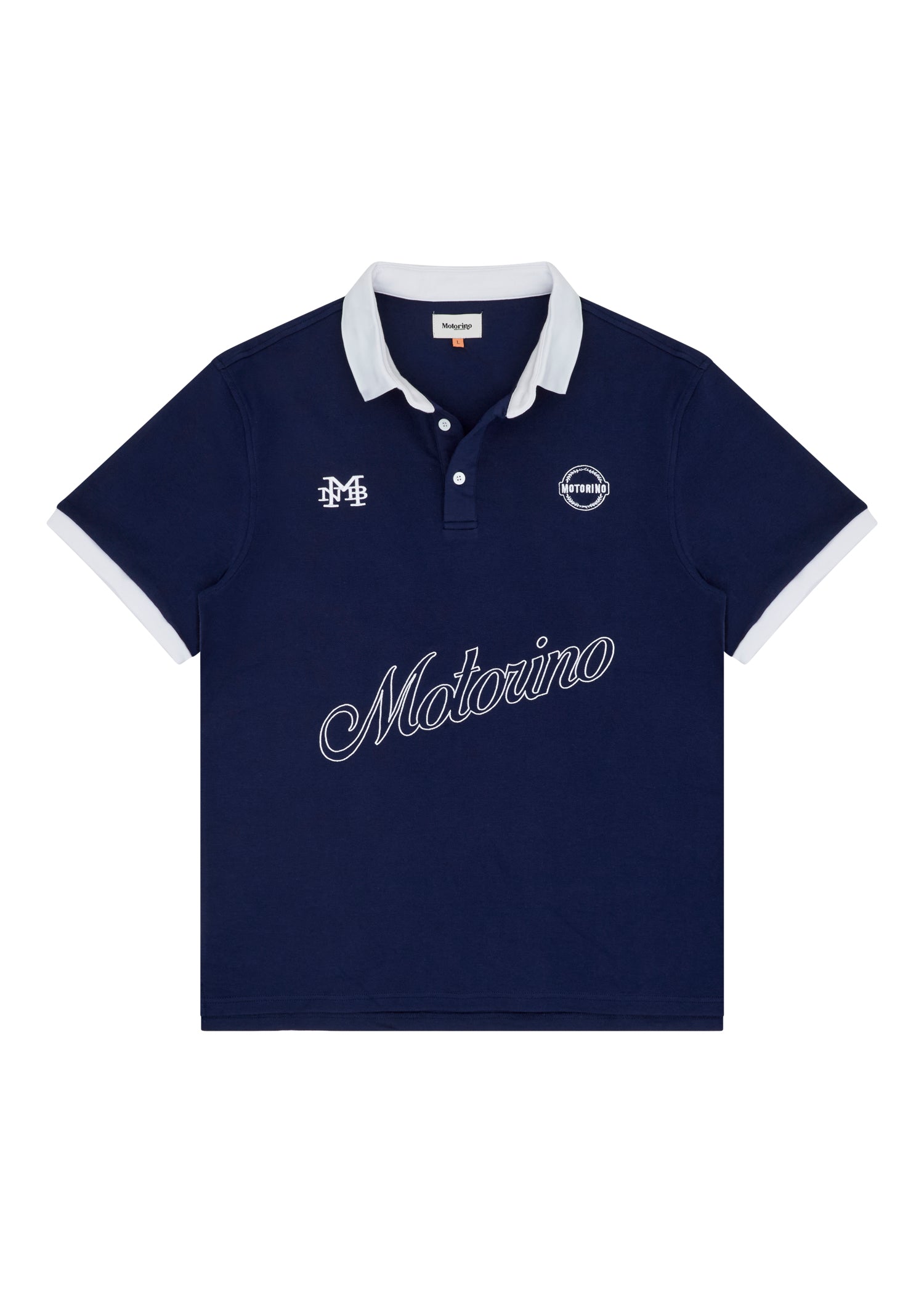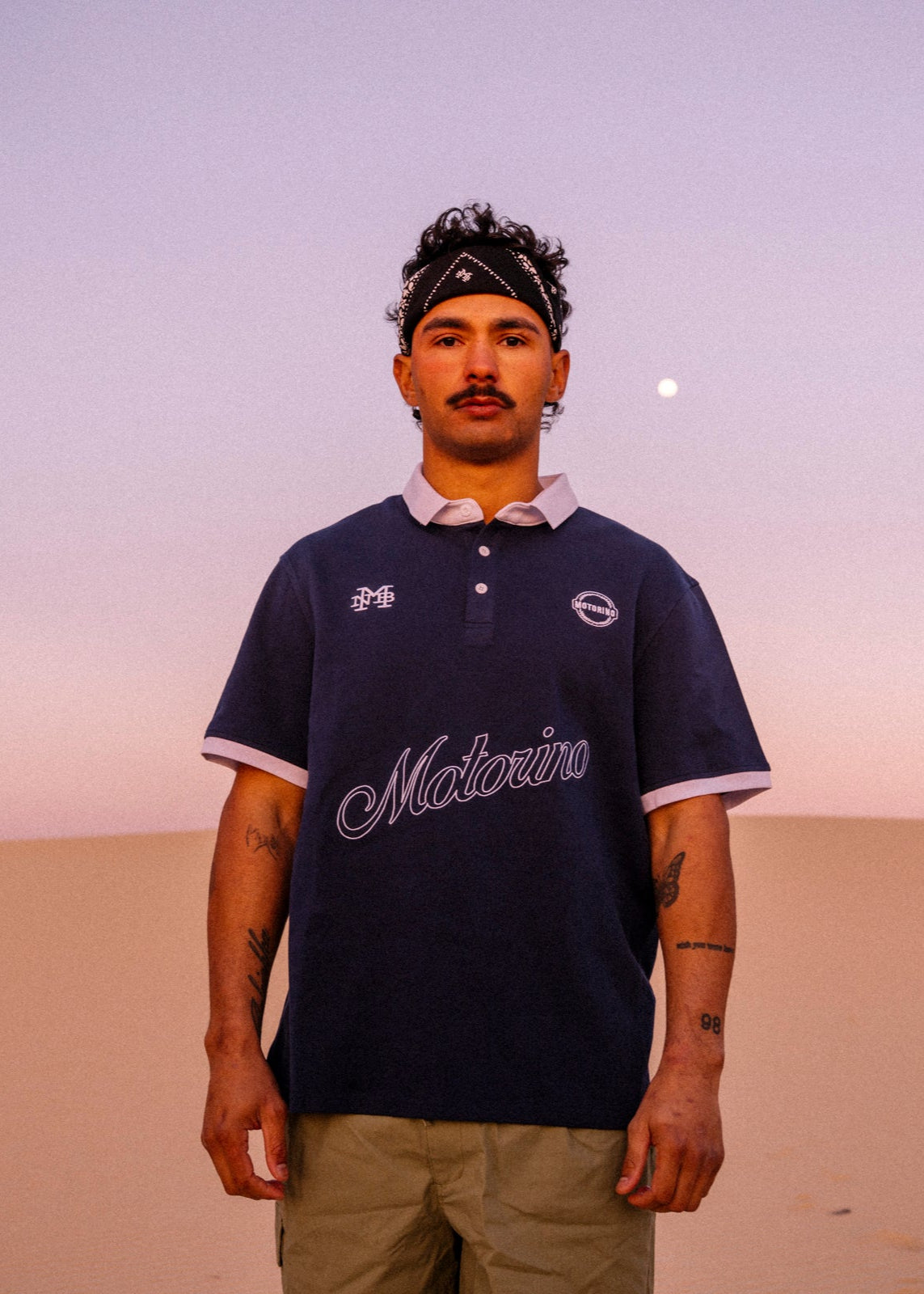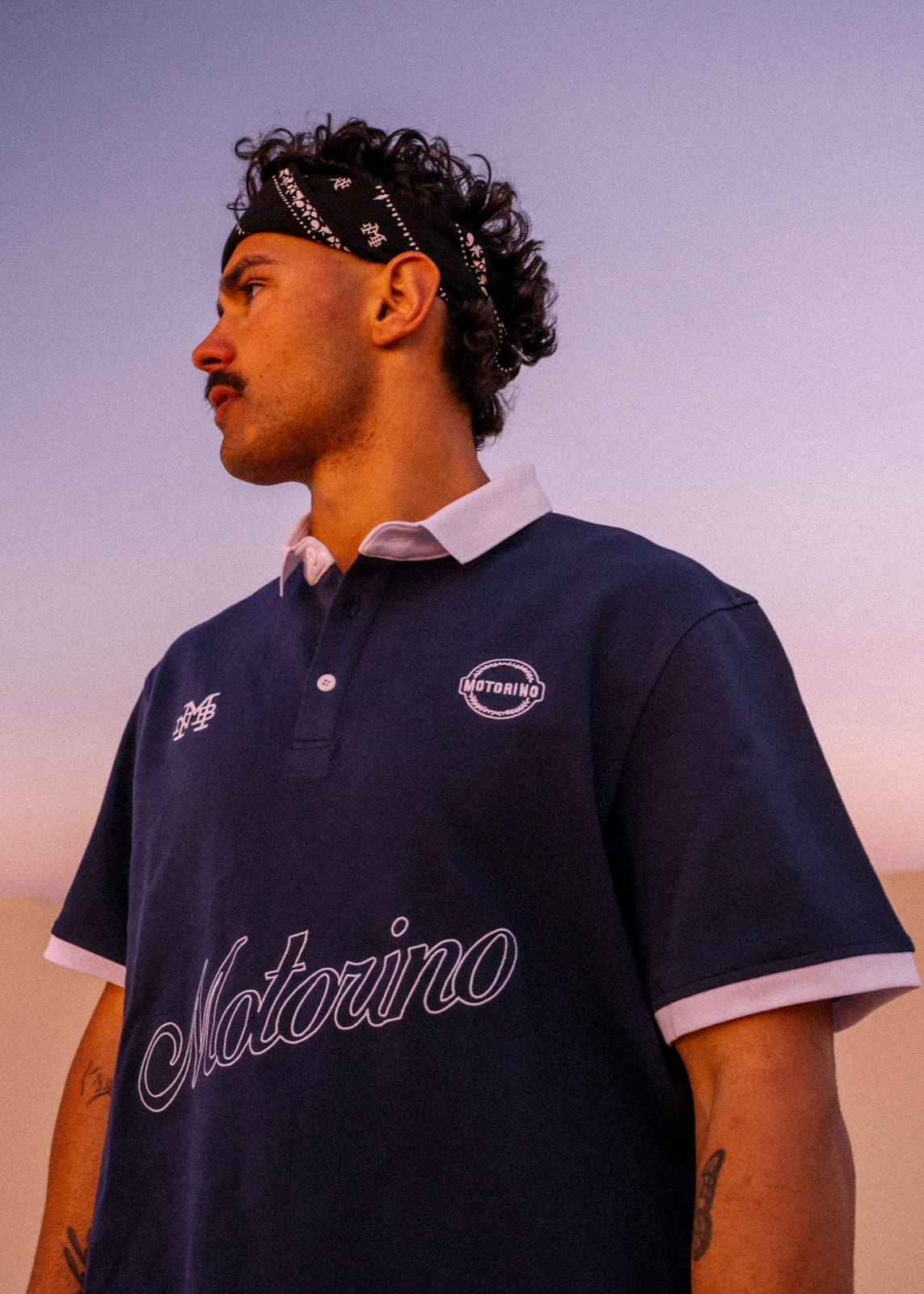 The Motorino Polo takes inspiration from vintage athletic wear, reimagined with a distinctly modern Motorino touch. Crafted from heavyweight 100% cotton, this piece delivers both comfort and durability with a structured, premium hand feel. The deep navy body is contrasted by a crisp white collar and sleeve trim, while embroidered details — including the bold Motorino logo across the chest and dual chest emblems — highlight the brand’s signature fusion of heritage and lifestyle. A relaxed, slightly boxy silhouette gives it that effortless balance between classic sportswear and refined street style.