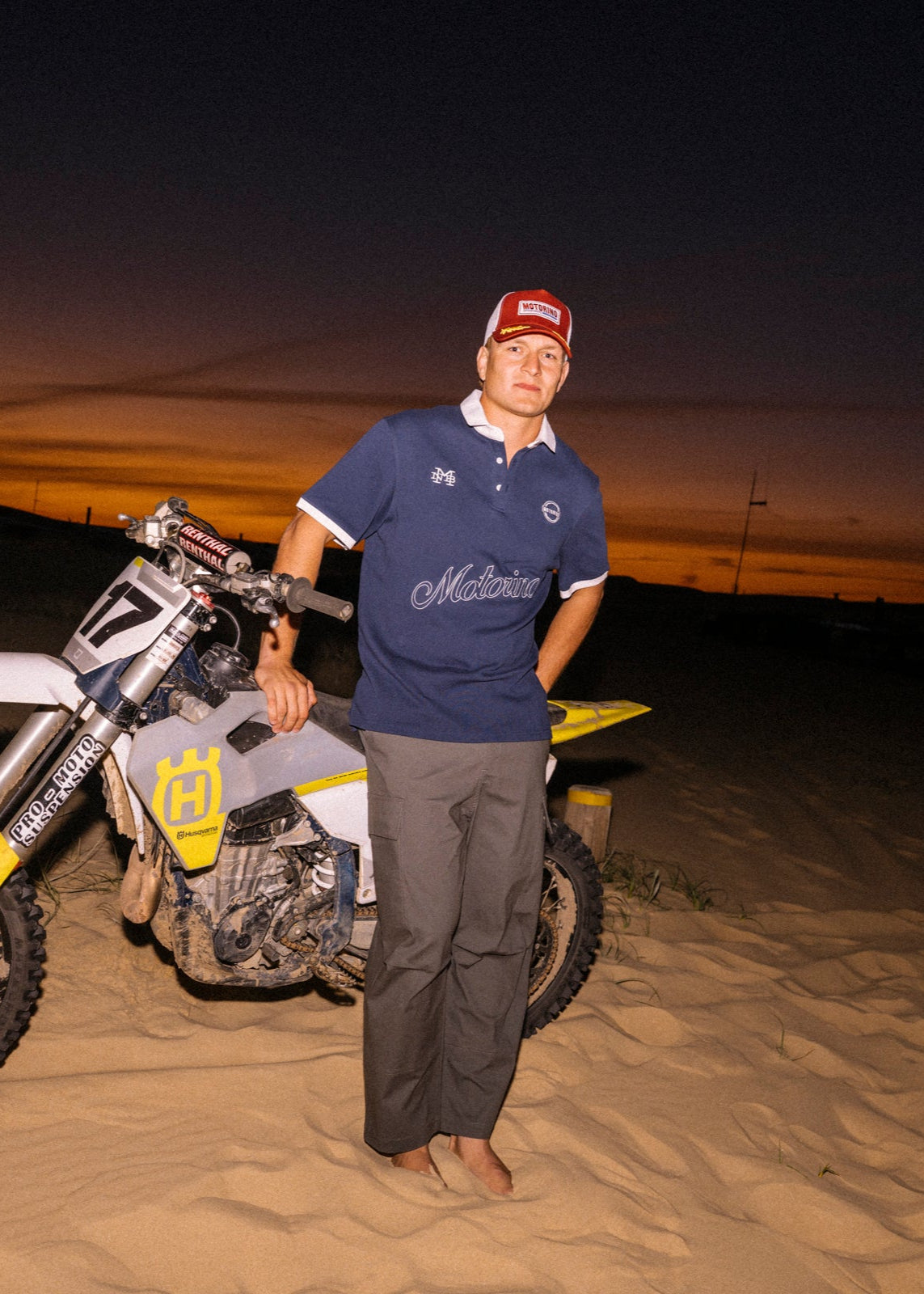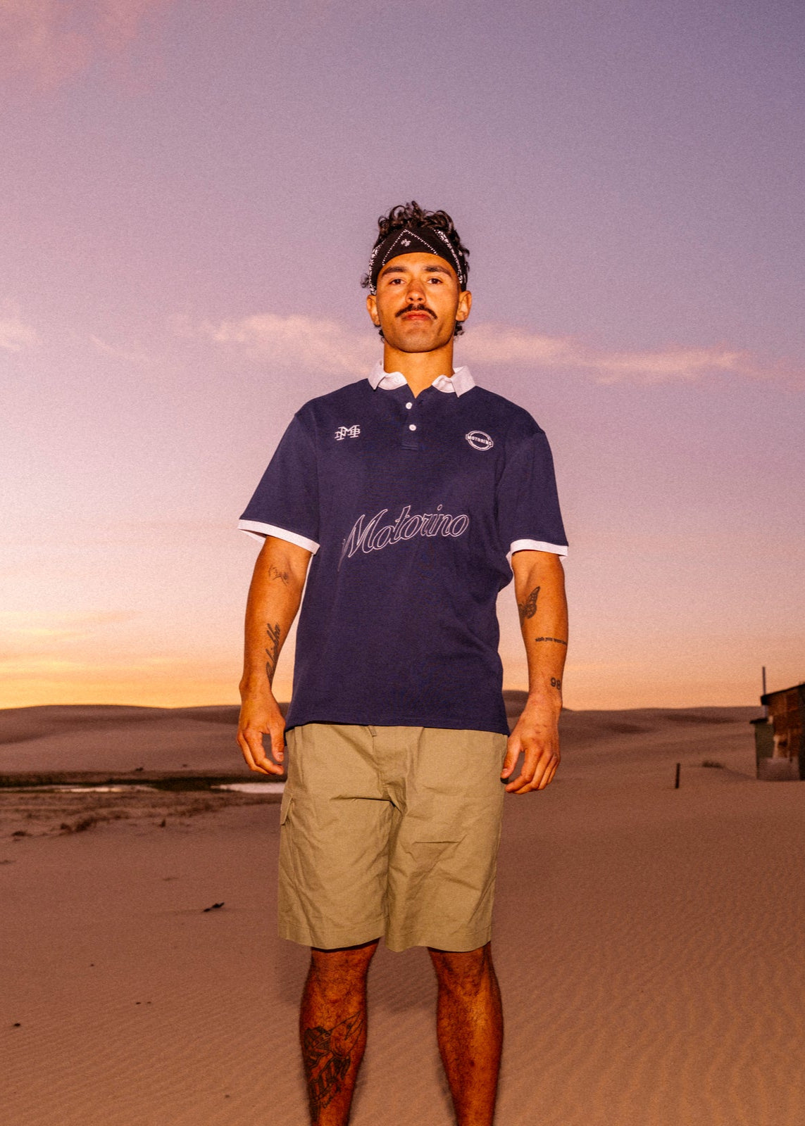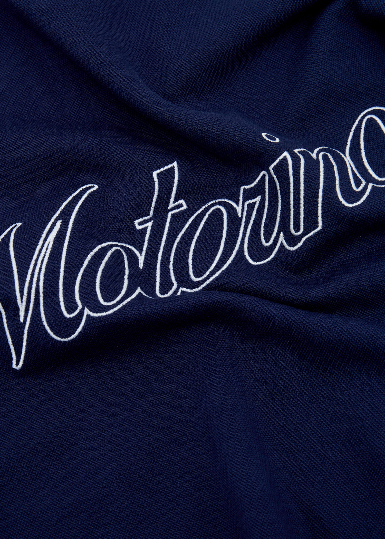 The Motorino Polo takes inspiration from vintage athletic wear, reimagined with a distinctly modern Motorino touch. Crafted from heavyweight 100% cotton, this piece delivers both comfort and durability with a structured, premium hand feel. The deep navy body is contrasted by a crisp white collar and sleeve trim, while embroidered details — including the bold Motorino logo across the chest and dual chest emblems — highlight the brand’s signature fusion of heritage and lifestyle. A relaxed, slightly boxy silhouette gives it that effortless balance between classic sportswear and refined street style.