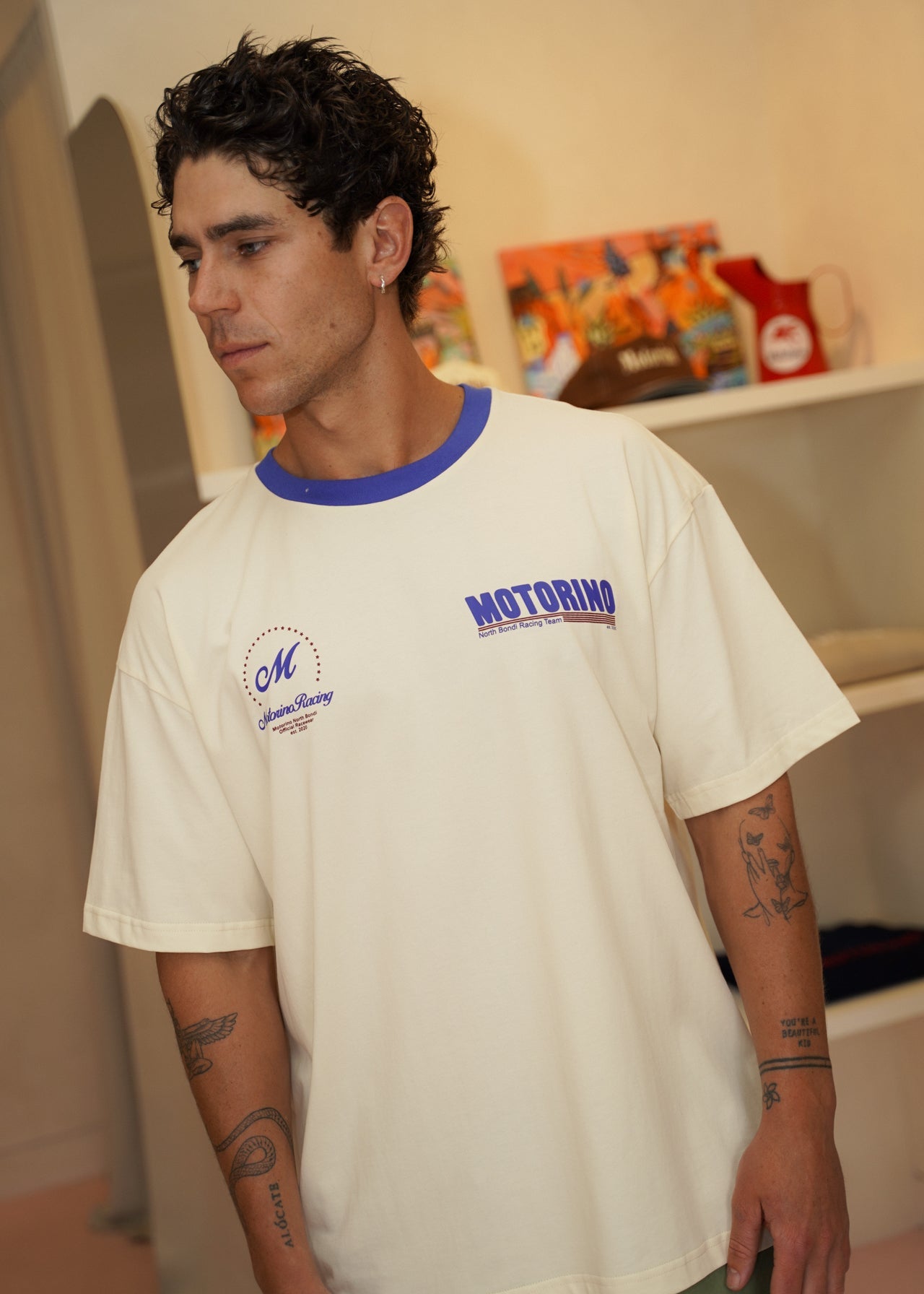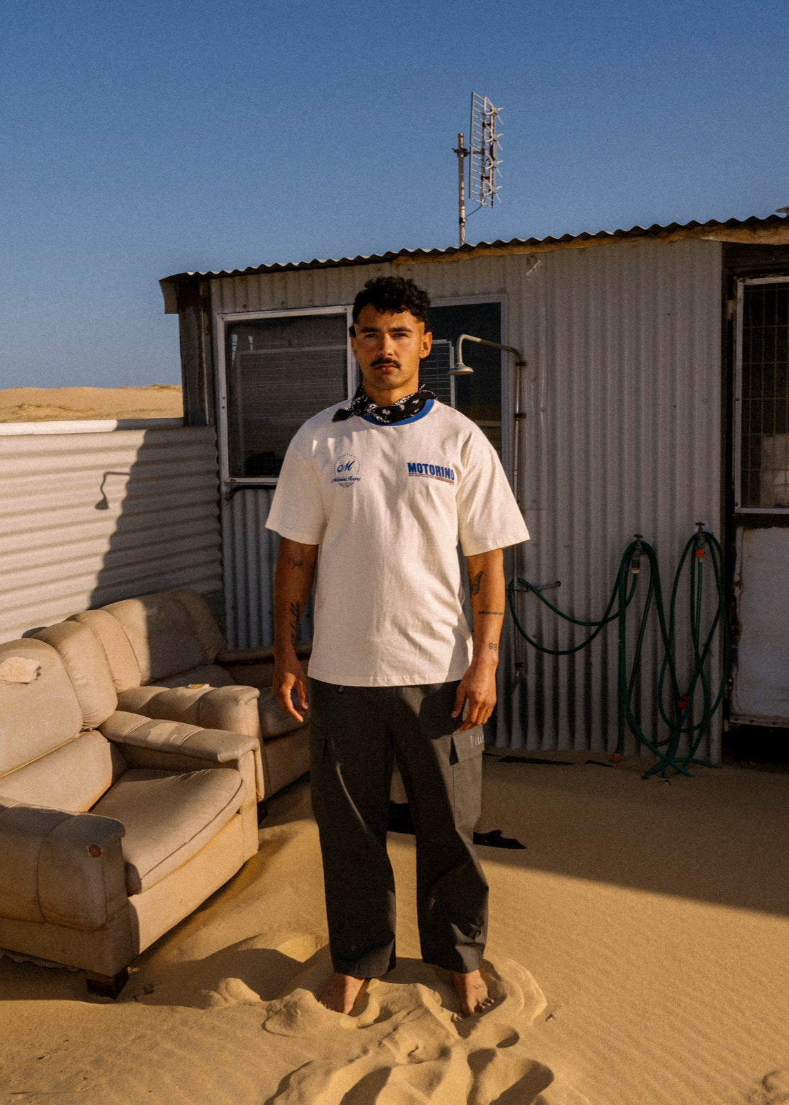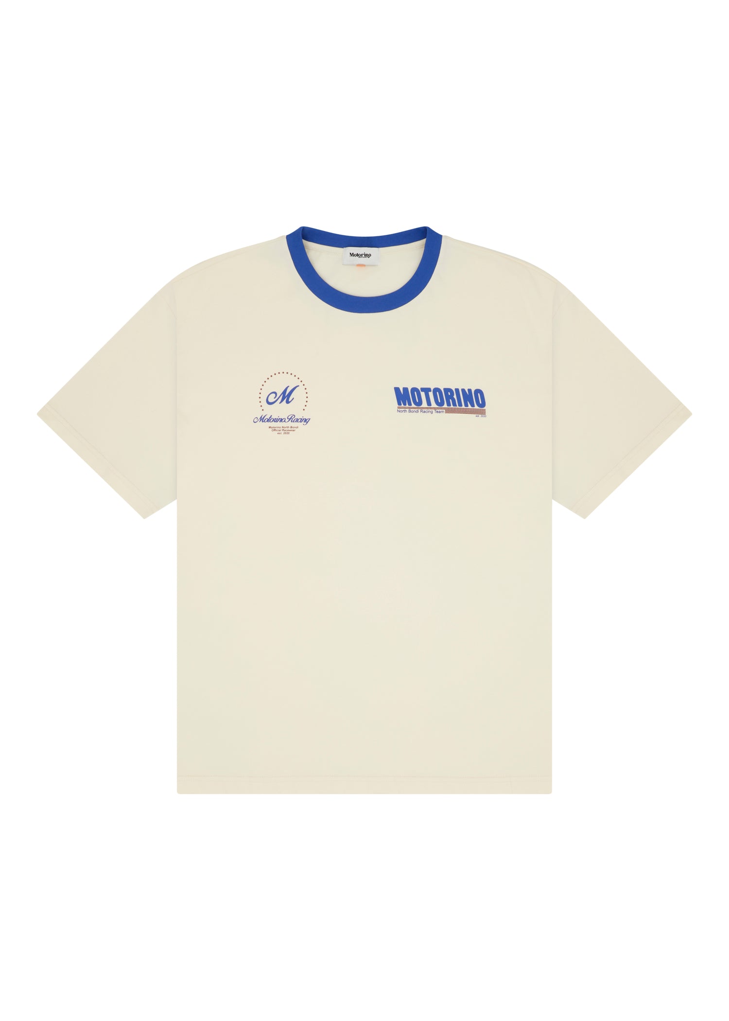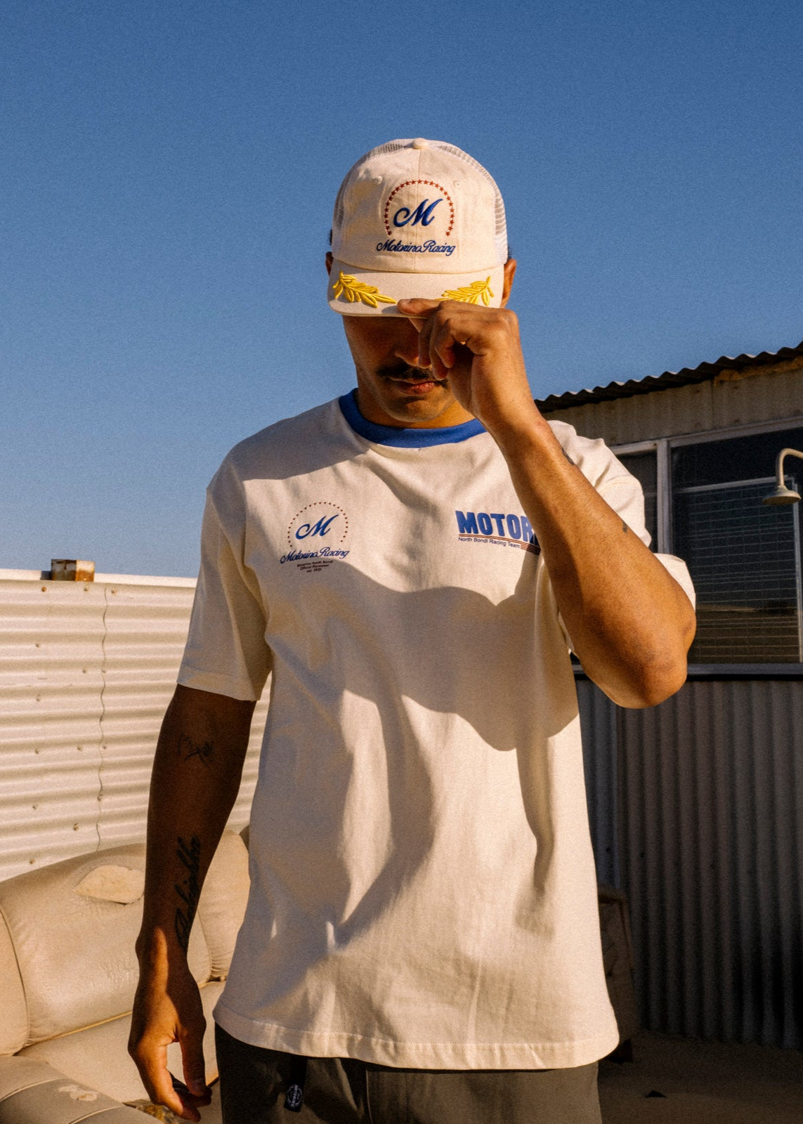 Inspired by vintage motorsport aesthetics, the Motorino Contrast Collar Tee in Off White with Blue detailing combines classic design with everyday comfort. Crafted from 100% premium cotton, this tee features a bold blue ribbed collar and for a crisp contrast. The front is finished with dual chest prints — the Motorino North Bondi Racing Team logo and Motorino Racing emblem — celebrating the brand’s heritage and nod to retro racing culture. Lightweight, breathable, and easy to wear, it’s the perfect piece for relaxed weekends or coastal days.