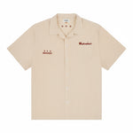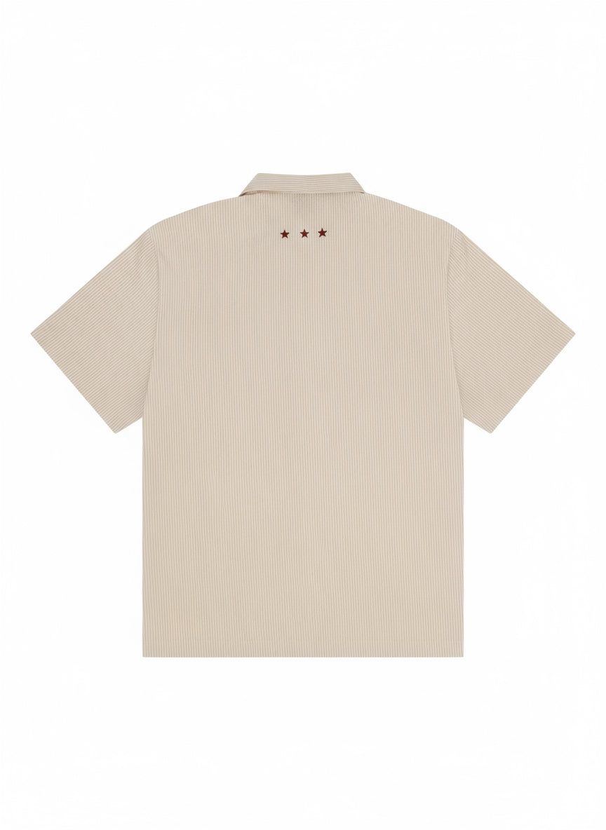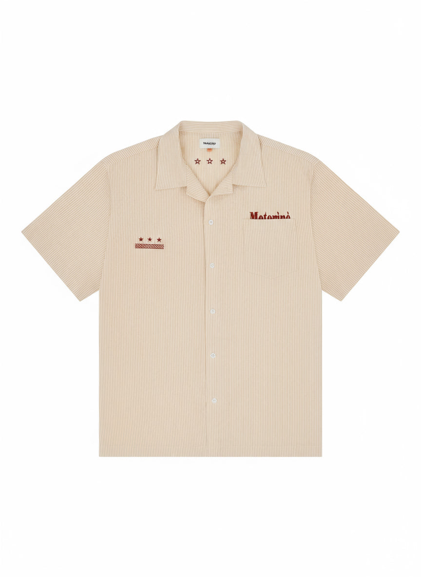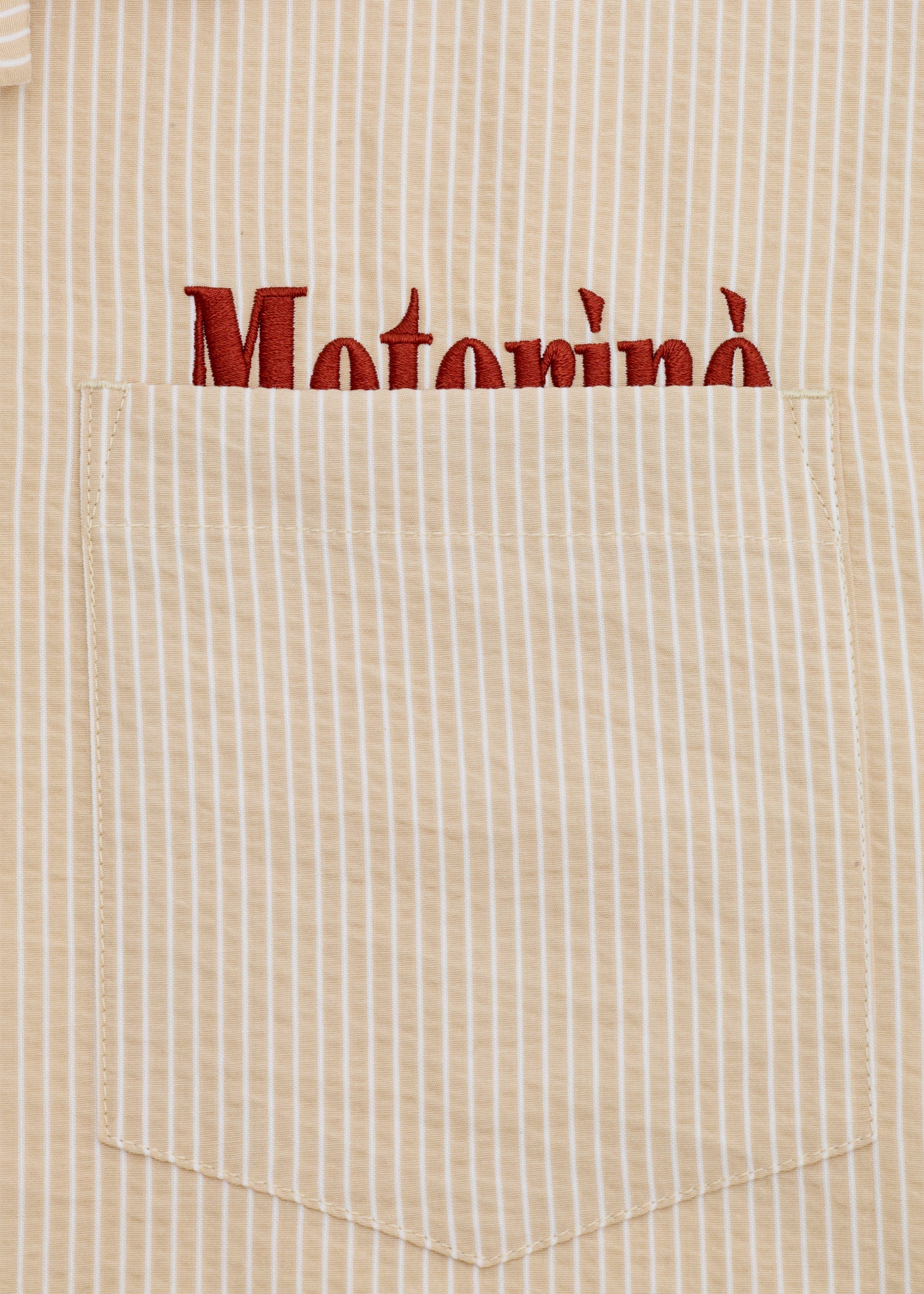 The Motorino Signature and Stripe Oxford shirt blends a vintage aesthetic with everyday wearability. This short-sleeve shirt features a subtle off-white base with fine dusty beige pinstripes, offering a clean look. Embroidered details at the chest and back complement the signature Motorino logo on the pocket, creating a distinctive balance of heritage and understated style. Designed with a relaxed silhouette, camp collar, and button-through front, it’s a versatile piece that transitions effortlessly from casual days to elevated evenings.