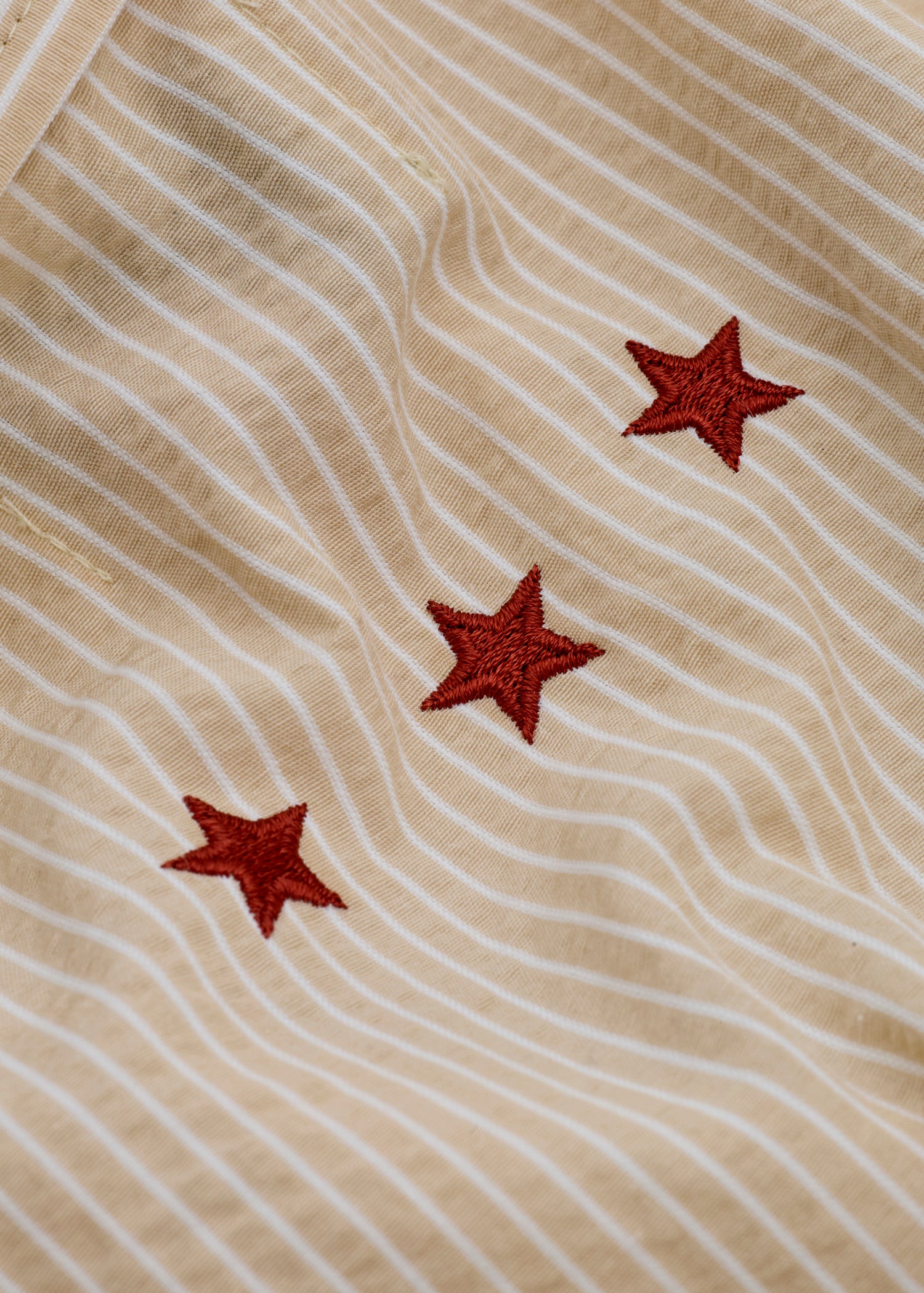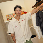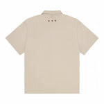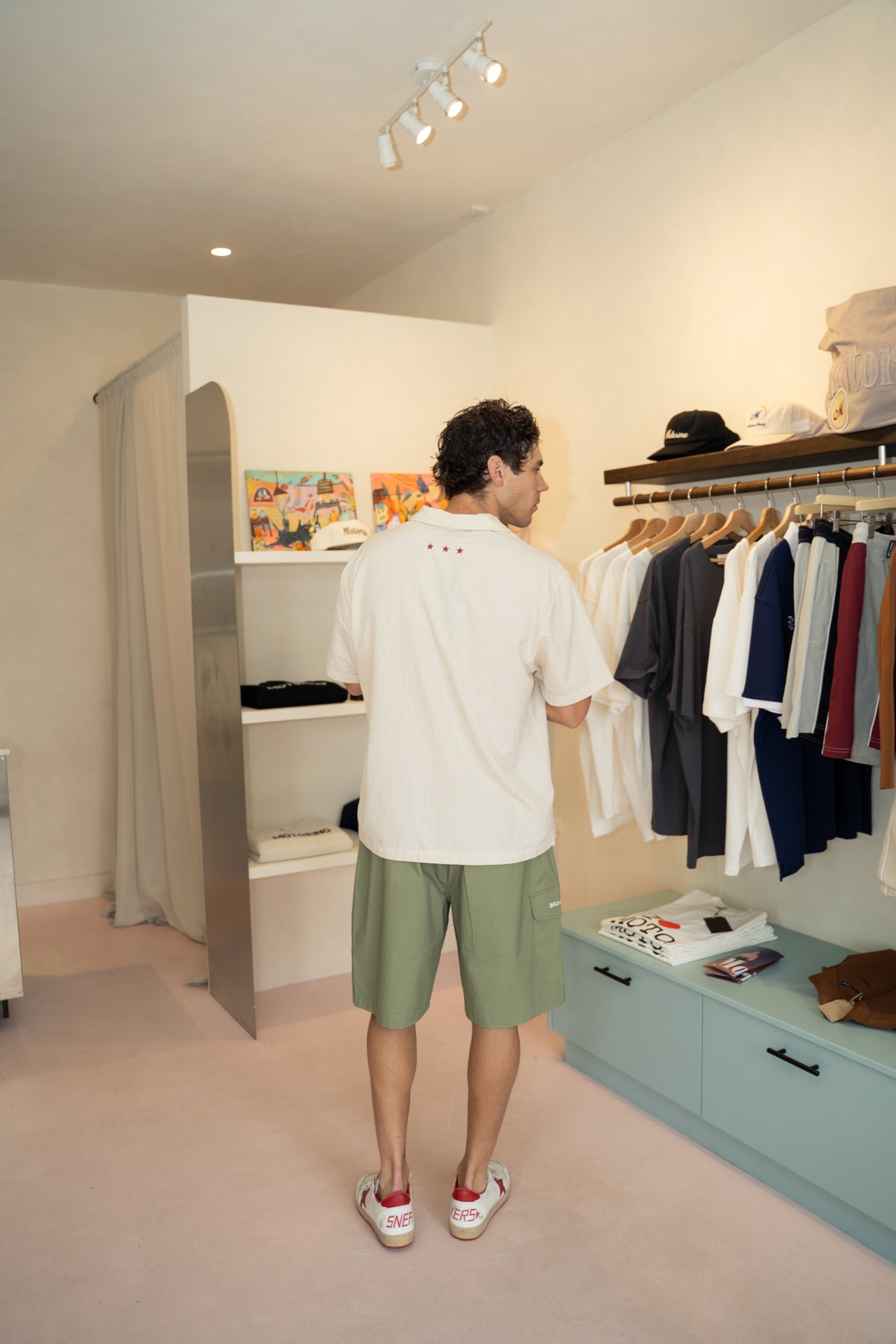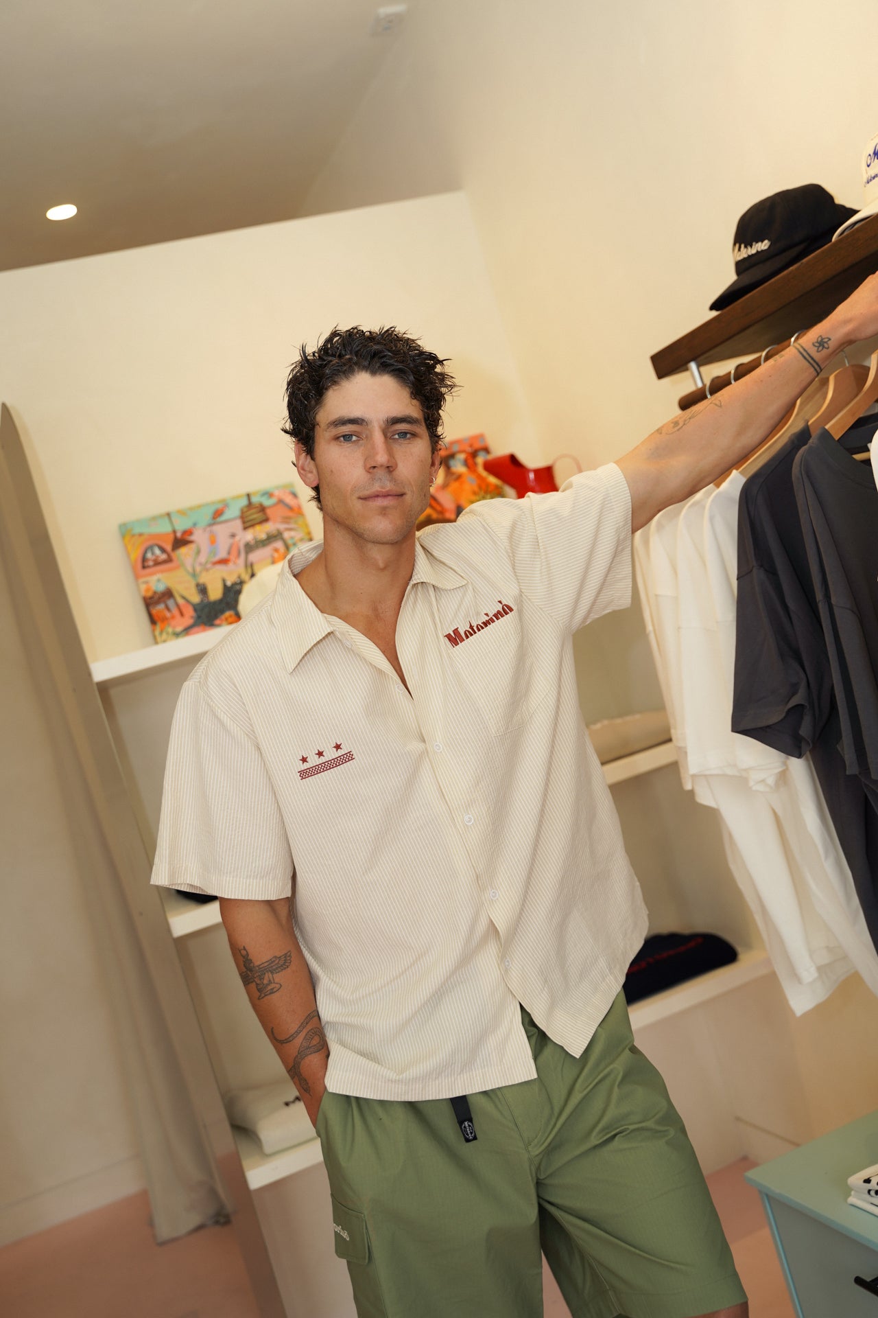 The Motorino Signature and Stripe Oxford shirt blends a vintage aesthetic with everyday wearability. This short-sleeve shirt features a subtle off-white base with fine dusty beige pinstripes, offering a clean look. Embroidered details at the chest and back complement the signature Motorino logo on the pocket, creating a distinctive balance of heritage and understated style. Designed with a relaxed silhouette, camp collar, and button-through front, it’s a versatile piece that transitions effortlessly from casual days to elevated evenings.