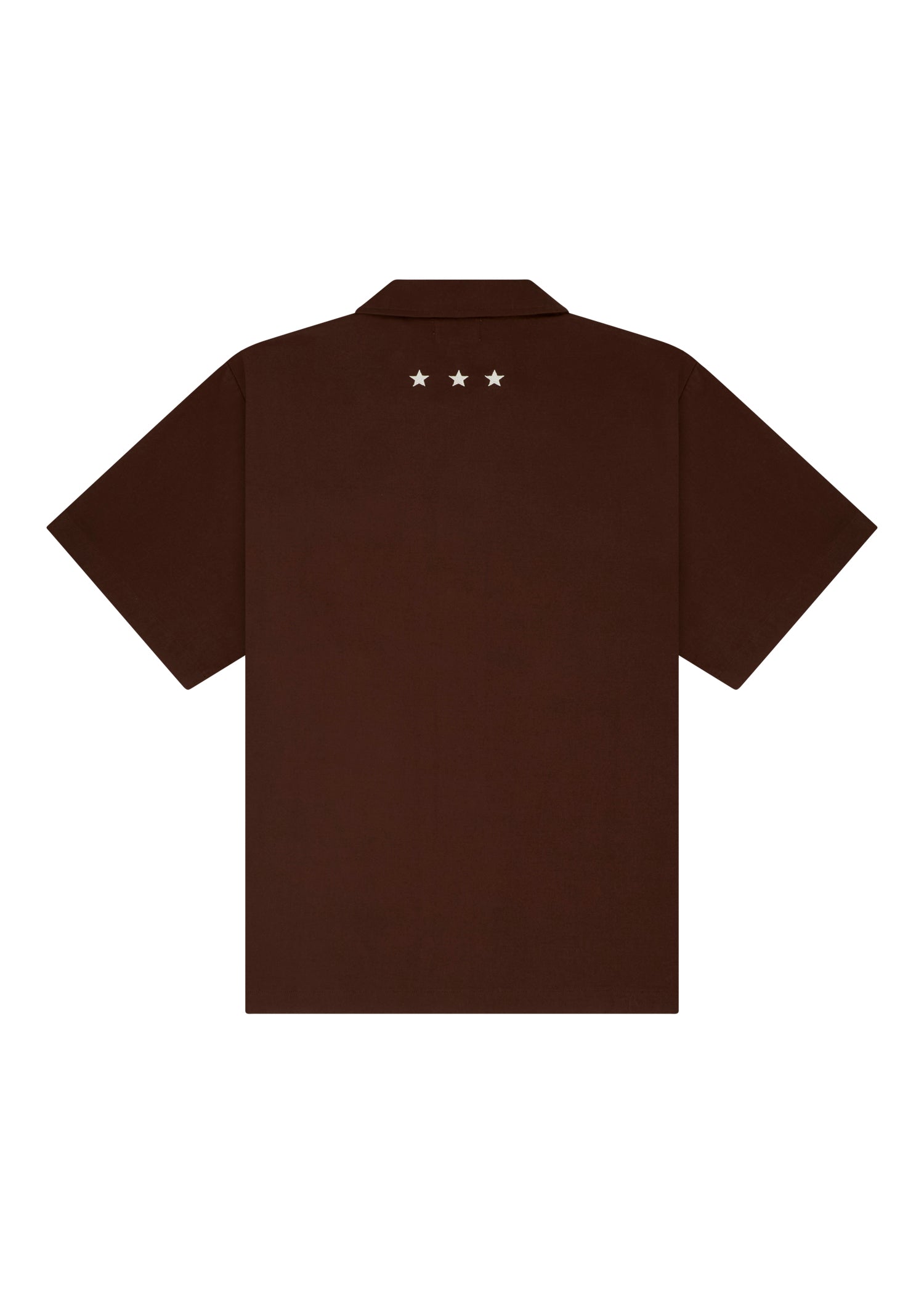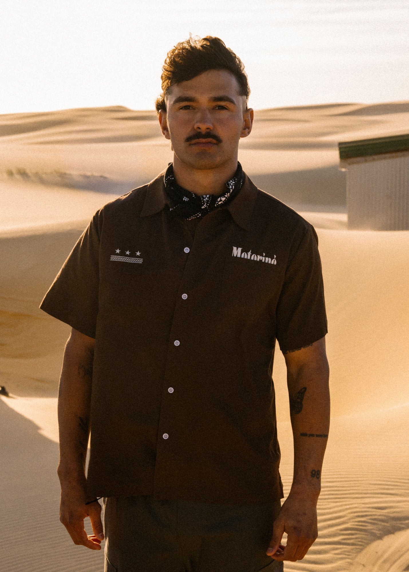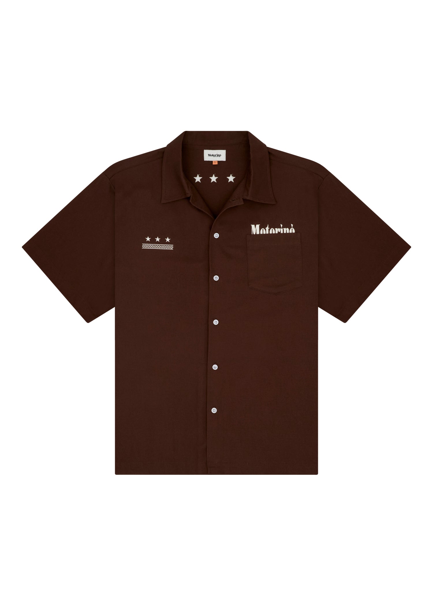 The Motorino Signature and Stars Shirt brings a sleek, workman style edge to an everyday staple. Cut from 100% cotton, this piece offers a structured yet comfortable midweight feel. The deep brown tone contrasts with crisp white embroidery - featuring Motorino’s signature logo on the chest pocket and star motifs on the front, and back. Designed with a relaxed silhouette, camp collar, and button-through front, it’s a versatile shirt that balances workwear heritage with contemporary styling.