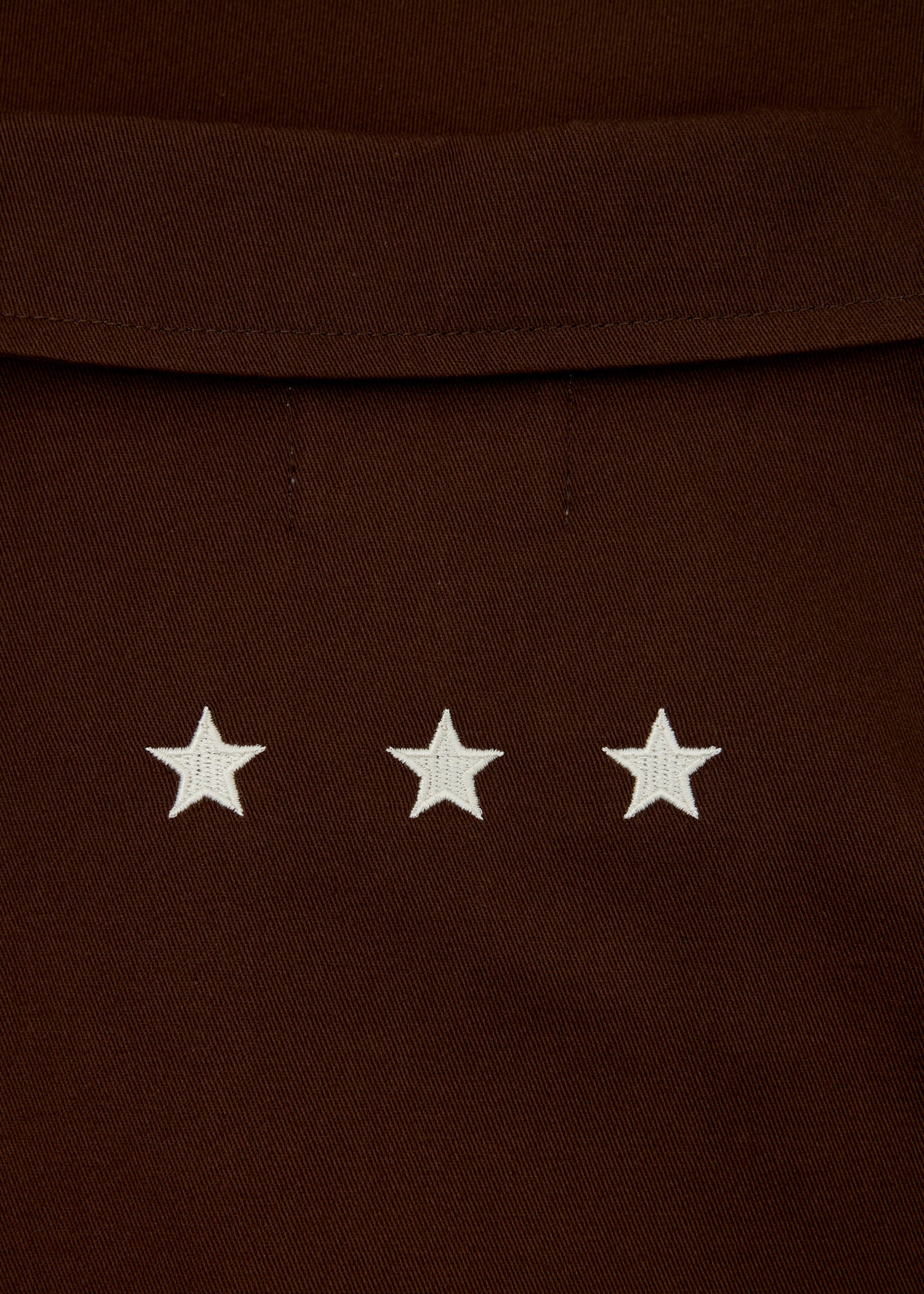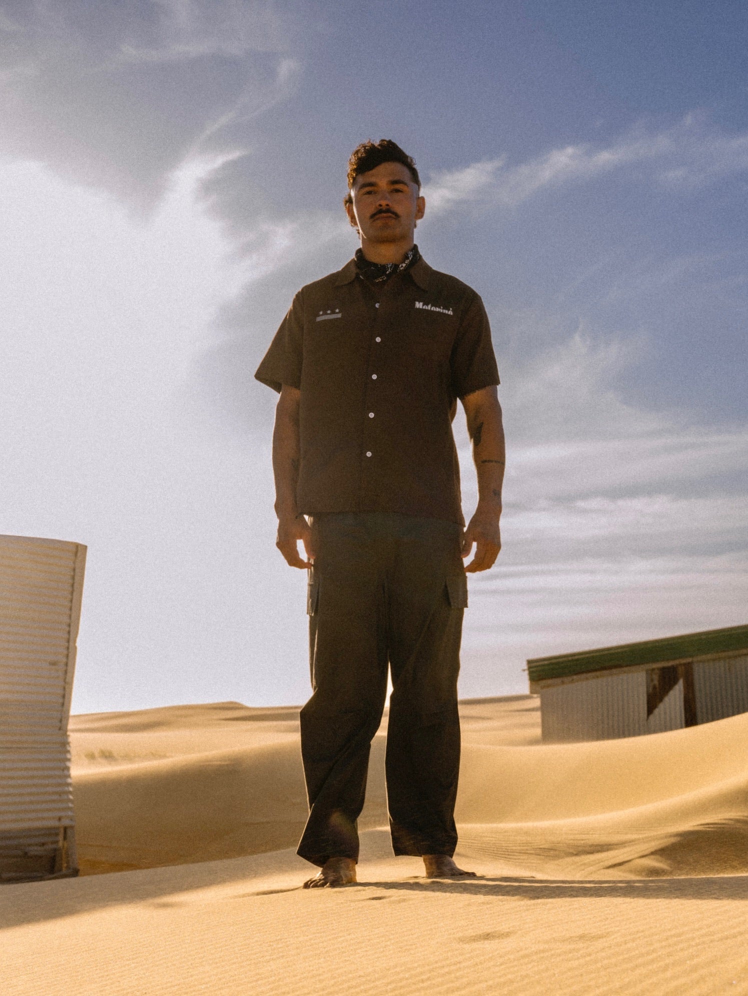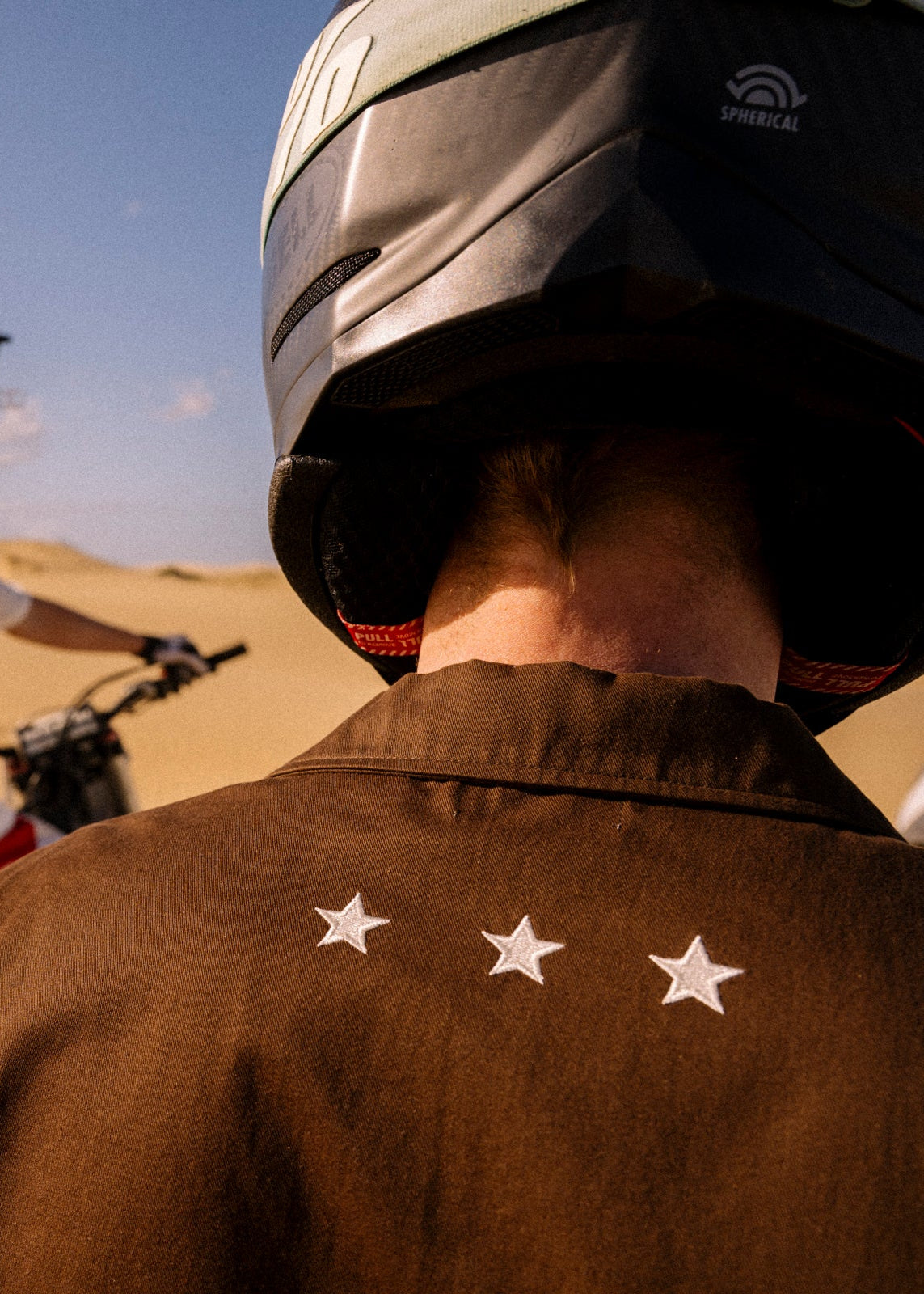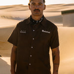 The Motorino Signature and Stars Shirt brings a sleek, workman style edge to an everyday staple. Cut from 100% cotton, this piece offers a structured yet comfortable midweight feel. The deep brown tone contrasts with crisp white embroidery - featuring Motorino’s signature logo on the chest pocket and star motifs on the front, and back. Designed with a relaxed silhouette, camp collar, and button-through front, it’s a versatile shirt that balances workwear heritage with contemporary styling.