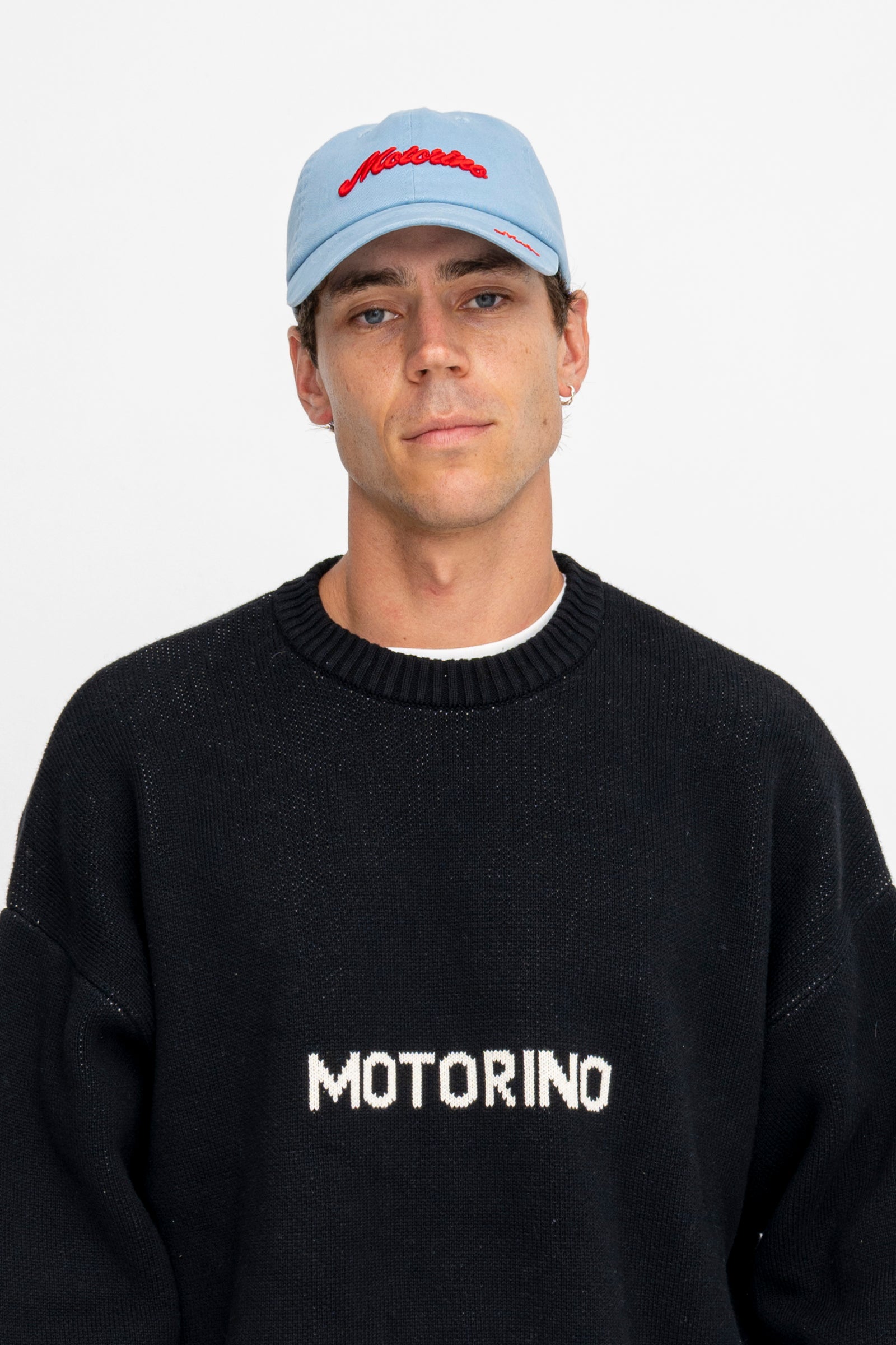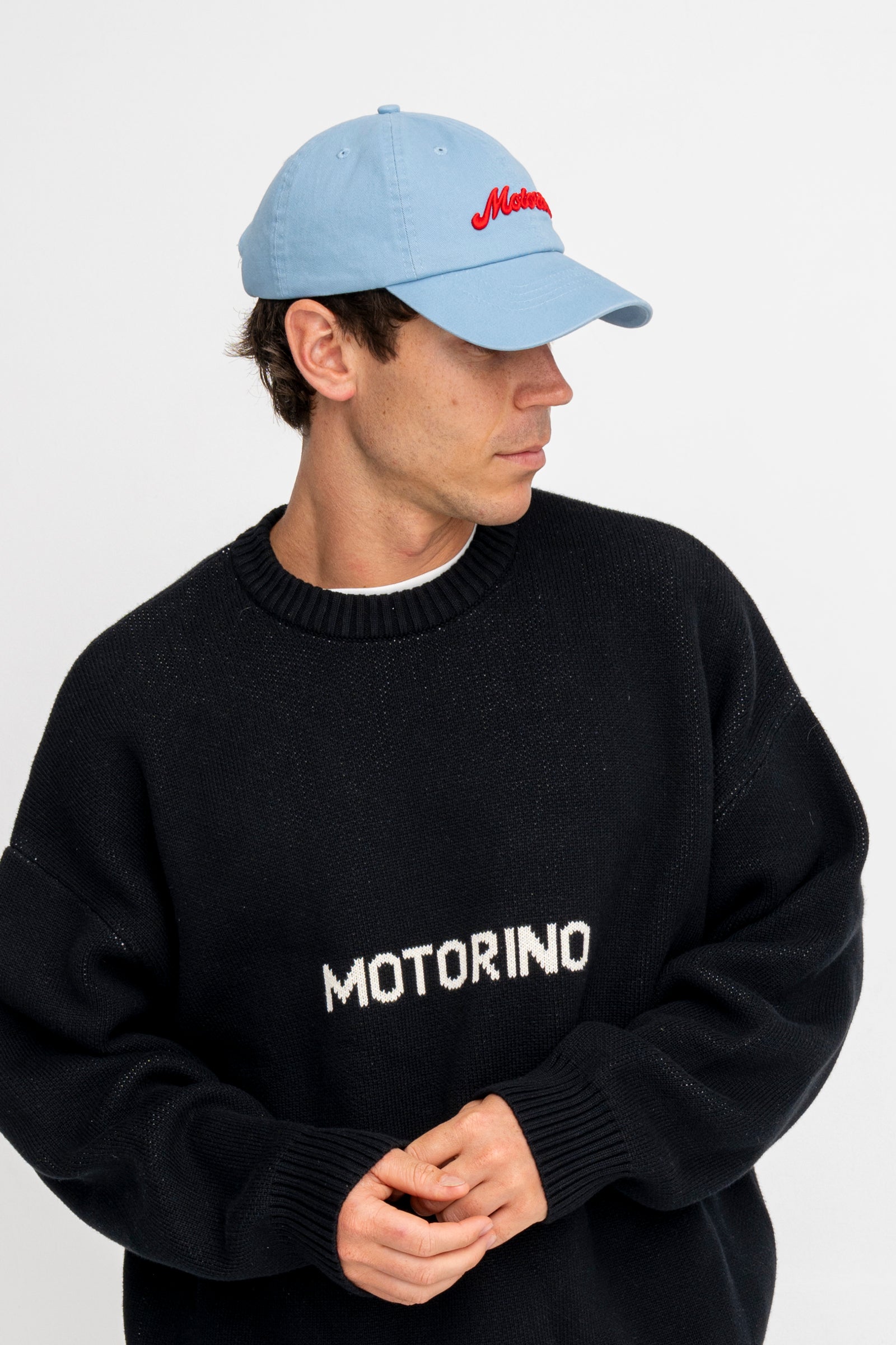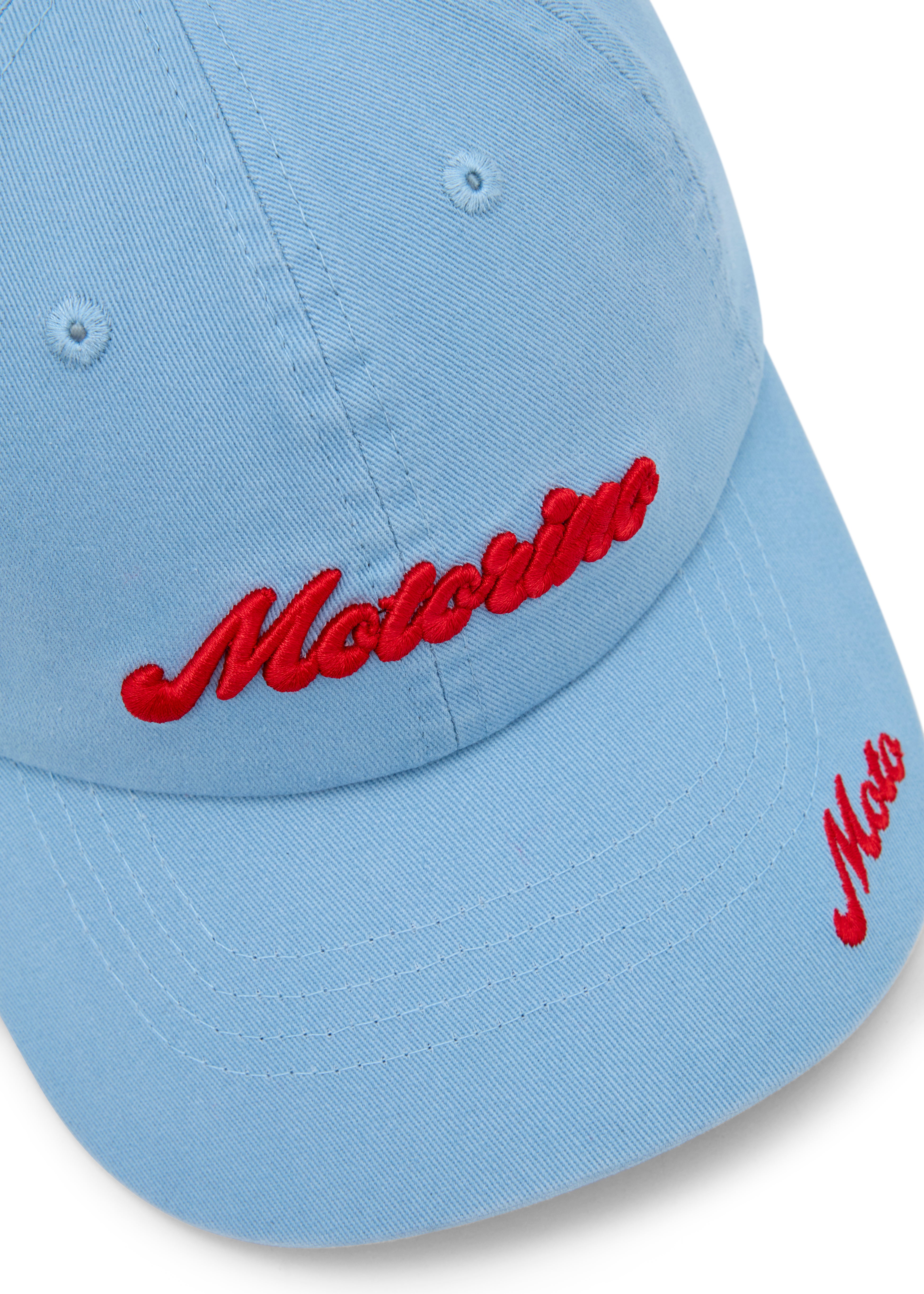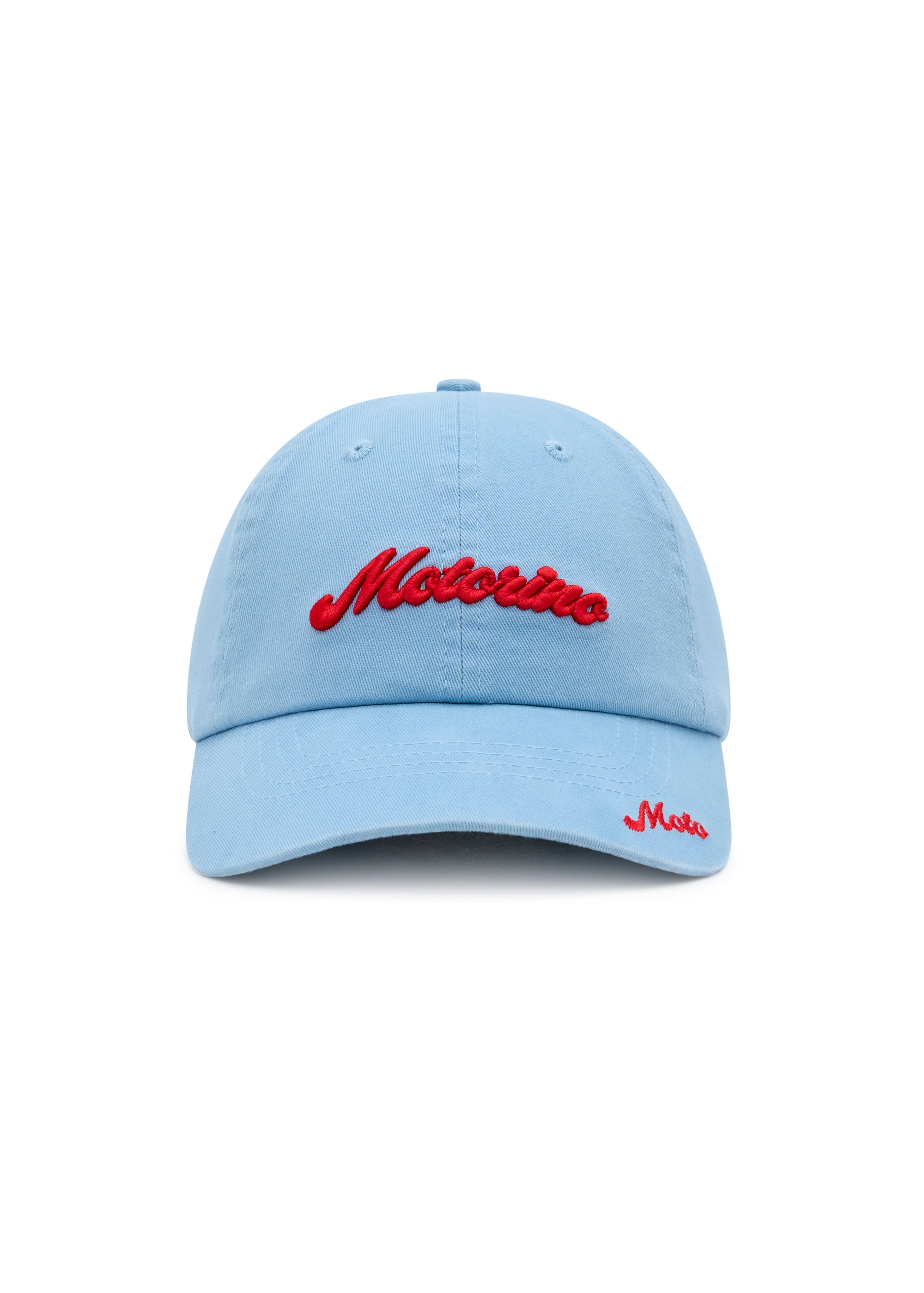 This blue-washed 100% cotton dad hat brings a laid-back edge with white embroidered Motorino on the front and a subtle Moto hit on top of the crown. Vintage-fade wash, metal buckle strap and low-profile shape make it an easy essential - one size fits all, no fuss, all style.